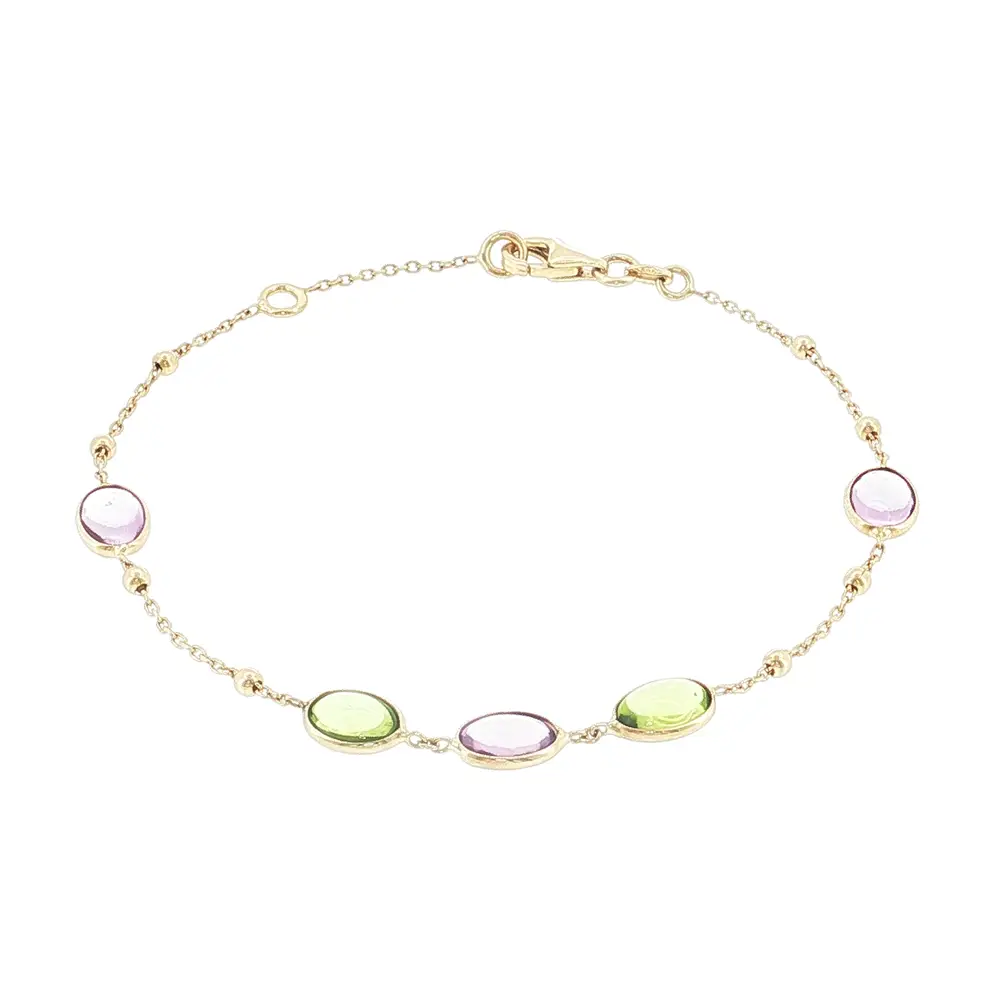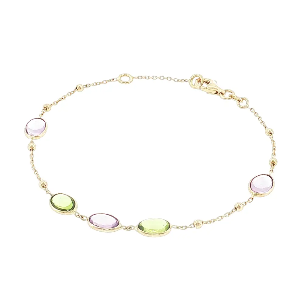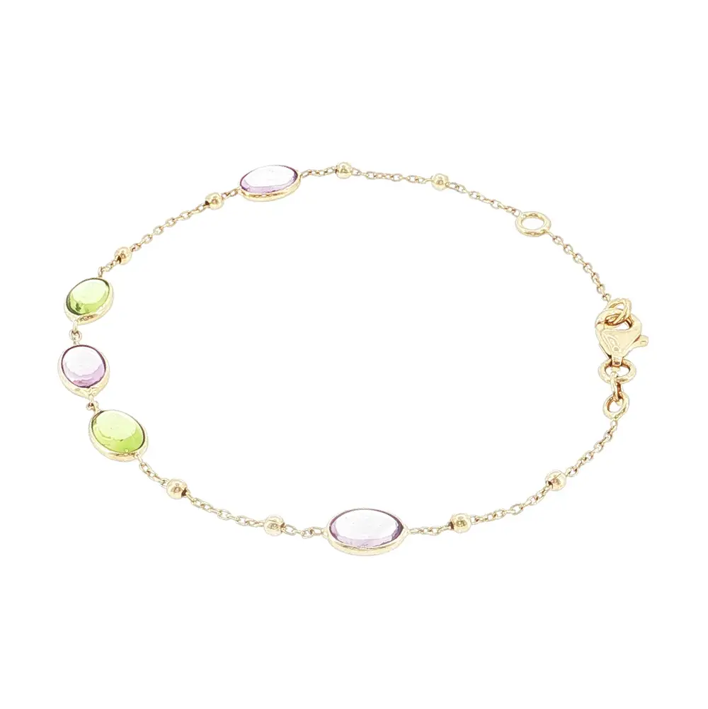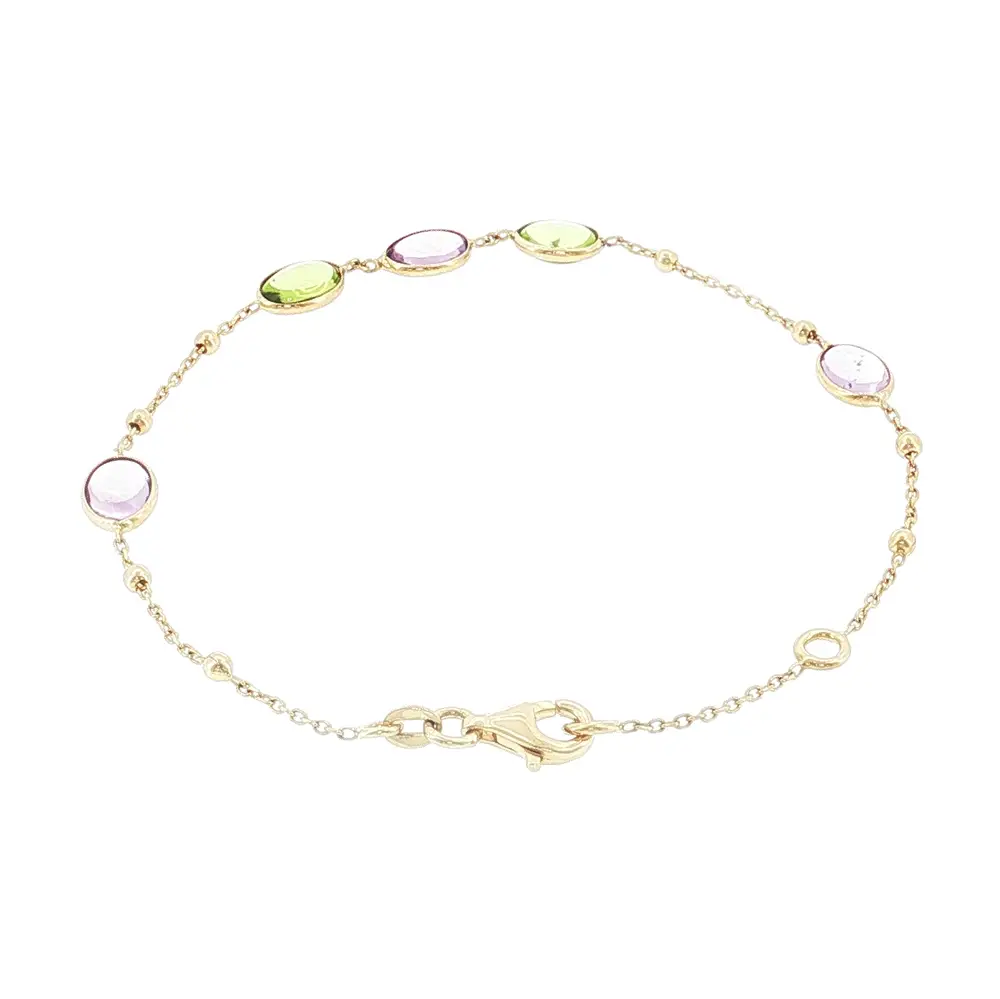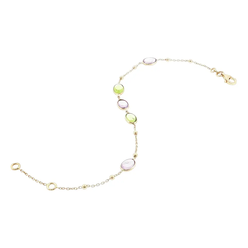 Elegant 14k gold bracelet with a fine chain stands out with its modern and playful design. The piece is decorated with 5 colored gemstones, complemented by small gold beads. The combination of colors and gold creates a fresh and timeless look, suitable for everyday wear and special occasions.
