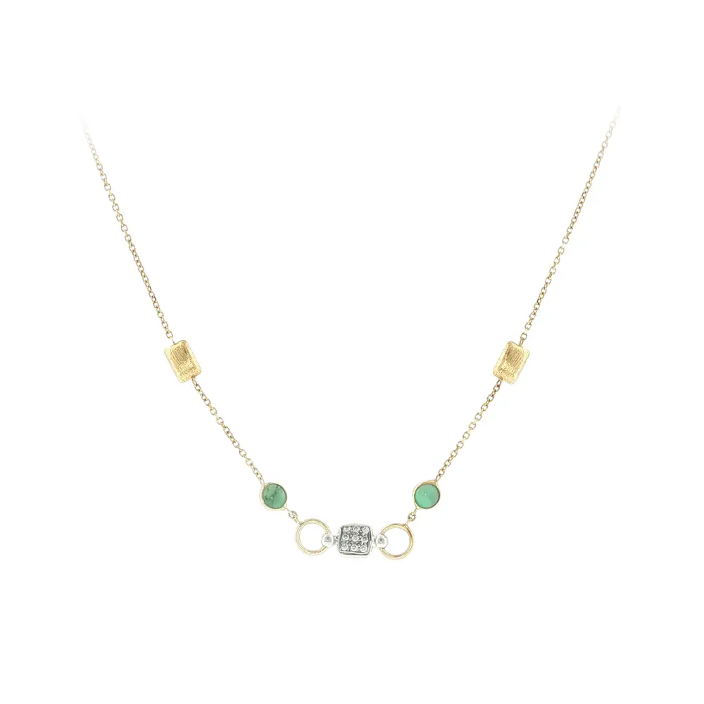 Elegant 14k gold necklace with green stones and zirconia is the perfect choice for women who seek a delicate yet eye-catching piece of jewelry. The green stones give the necklace a fresh and luxurious look, while the sparkling zirconia enhance its elegance. It is ideal for everyday wear as well as special occasions.