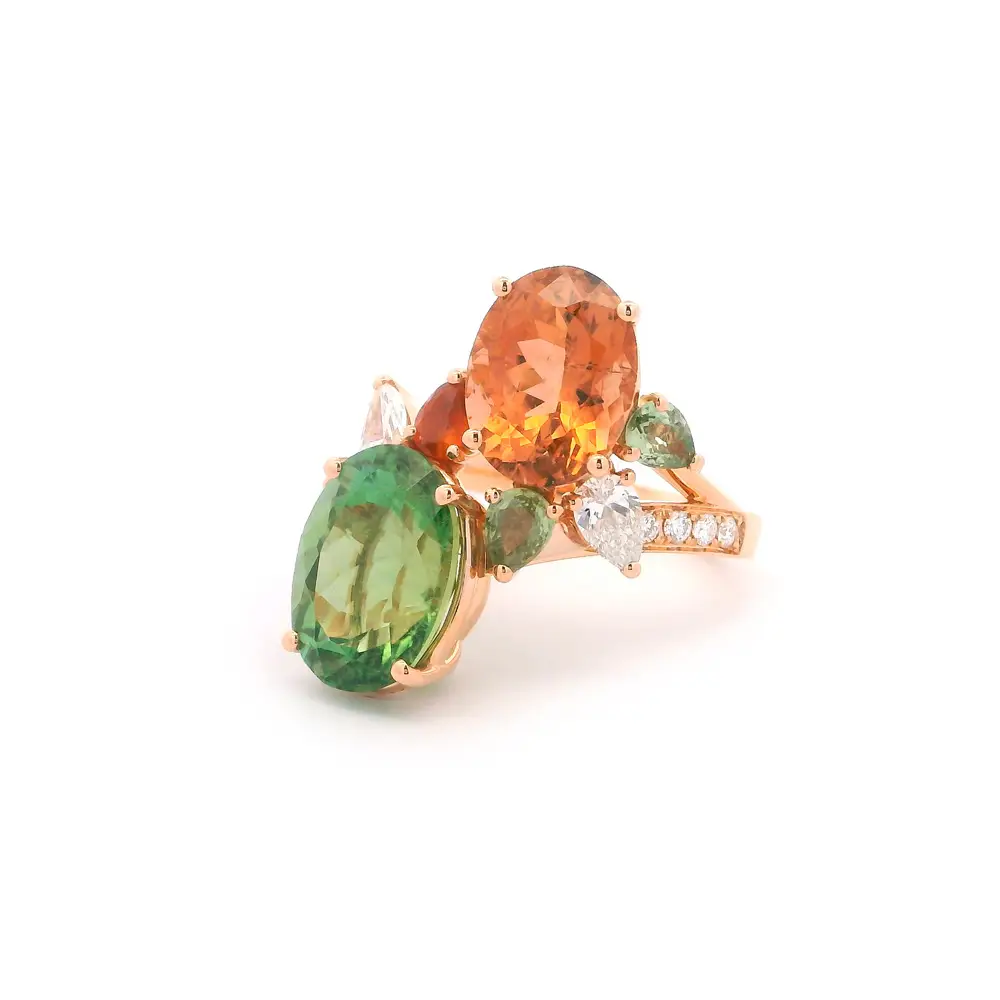 This exceptional ring is crafted from 18kt rose gold and adorned with a combination of precious gemstones. The centerpiece features two oval tourmalines in vivid green and orange hues, creating a harmonious yet striking contrast.