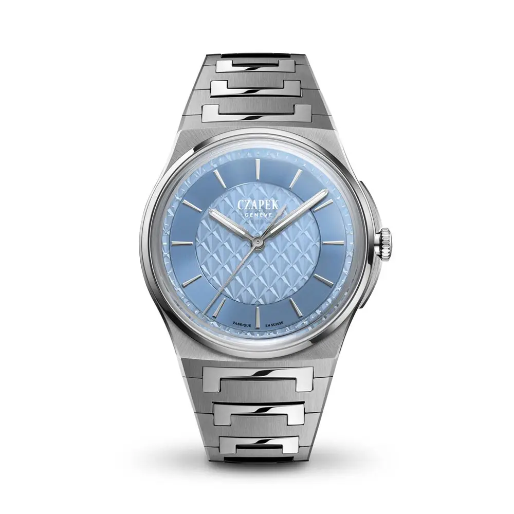 The Czapek Antarctique Sashiko Azure S watch presents a unique fusion of Japanese aesthetics and Swiss horological precision. Its name refers to the traditional Japanese embroidery technique sashiko, which is reflected in the distinctive texture of the blue analog dial. This intricate pattern adds unmistakable depth and character to the timepiece.