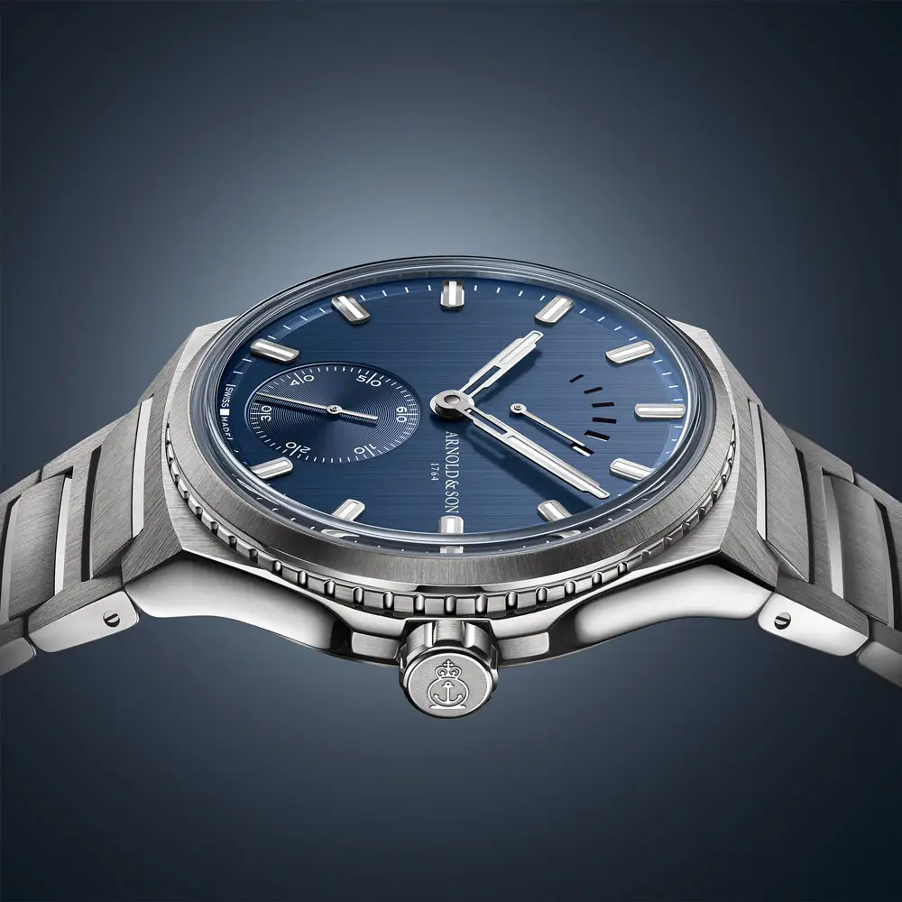 The Arnold & Son Longitude Titanium masterfully combines marine heritage, technical precision, and contemporary design. The 42.5 mm titanium case offers exceptional lightness and durability, while the vertically brushed ocean-blue dial with luminescent markers evokes the spirit of the sea. A finely notched bezel recalls the brand’s legacy of marine chronometers.