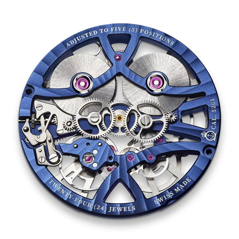 At its core beats the hand-wound A&S 5201 calibre with an impressive 90-hour power reserve, featuring blue PVD-treated bridges and rhodium-plated components for remarkable contrast and depth. Hours and minutes are displayed centrally, with a small seconds subdial at 7 o’clock, emphasizing the perfectly balanced symmetry that defines Arnold & Son craftsmanship.
