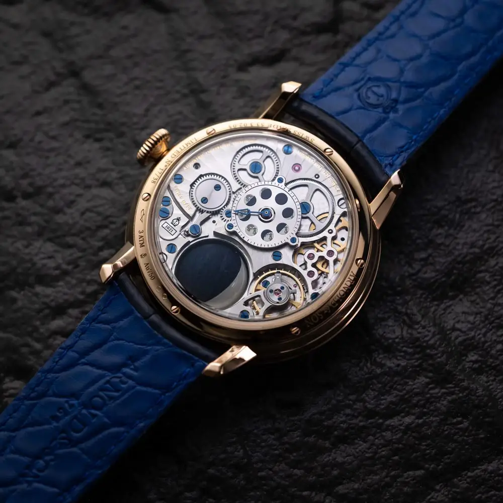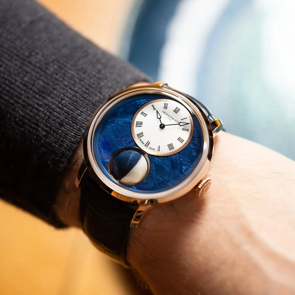 The centerpiece is the rotating 3D moon phase, composed of half Cacholong opal and half blue PVD meteorite. This unique mechanism is powered by the in-house calibre A&S1021, offering an impressive 90-hour power reserve and a moon phase accuracy with a deviation of just one day every 122 years.