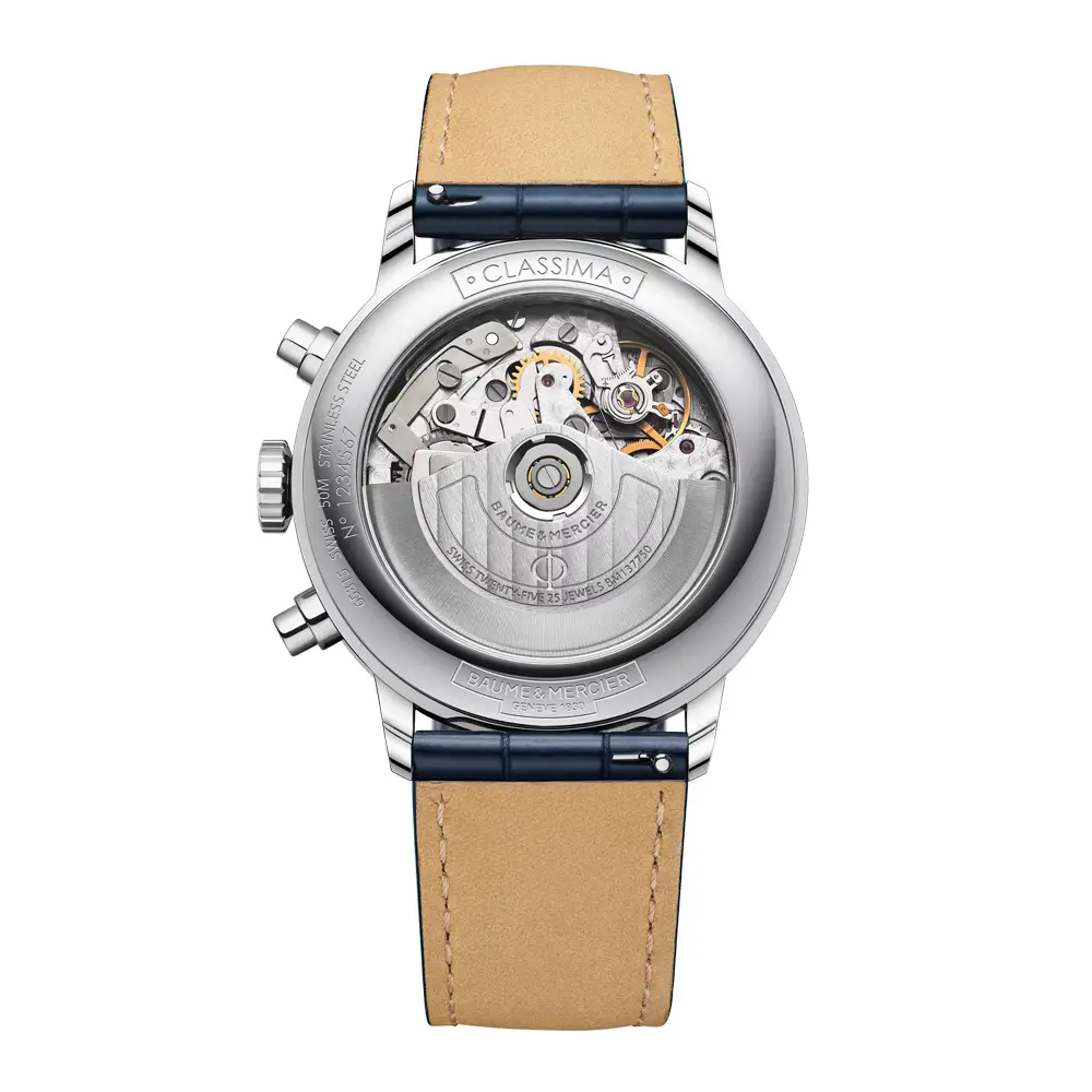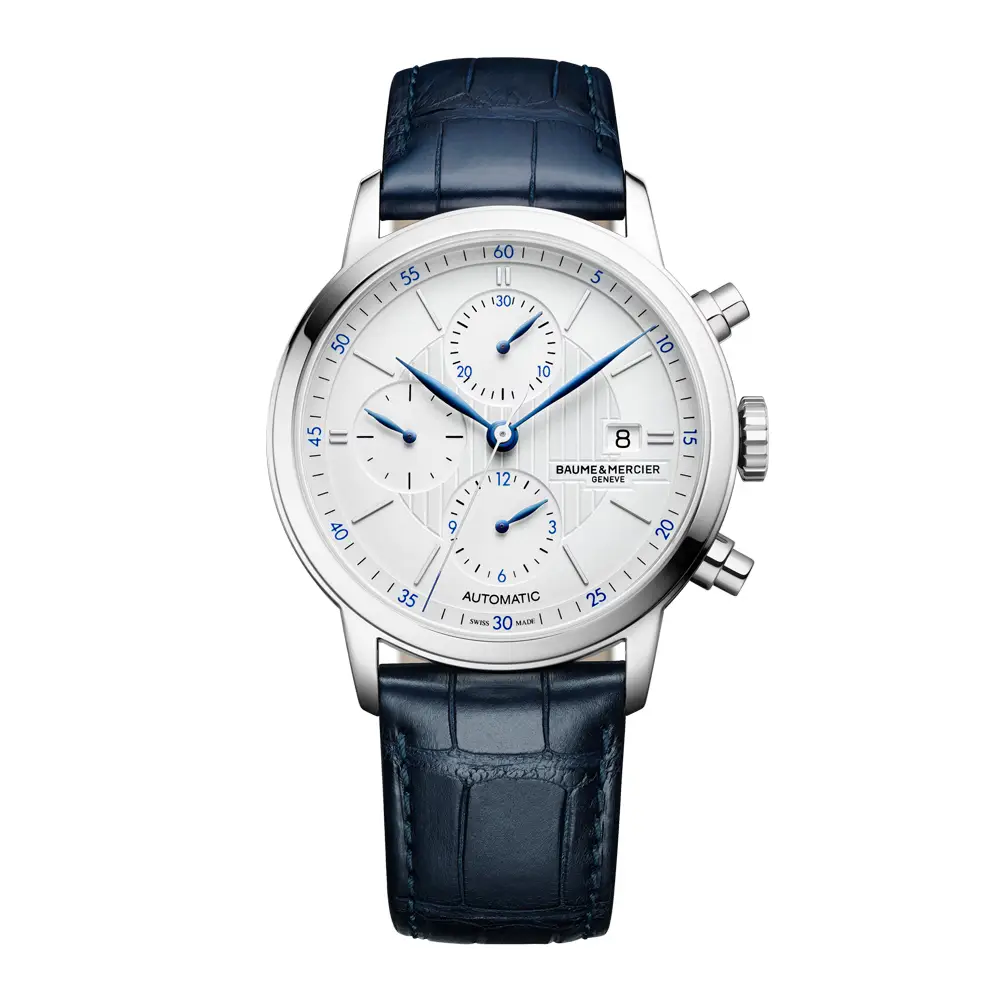 Baume & Mercier Classima M0A10330 combines classical elegance with the technical mastery of Swiss watchmaking. The 42 mm polished stainless steel case frames a silver guilloché dial with three sub-dials and blue leaf-shaped hands, creating a perfectly balanced and sophisticated look. The blue alligator leather strap adds a refined touch and enhances its timeless appeal.