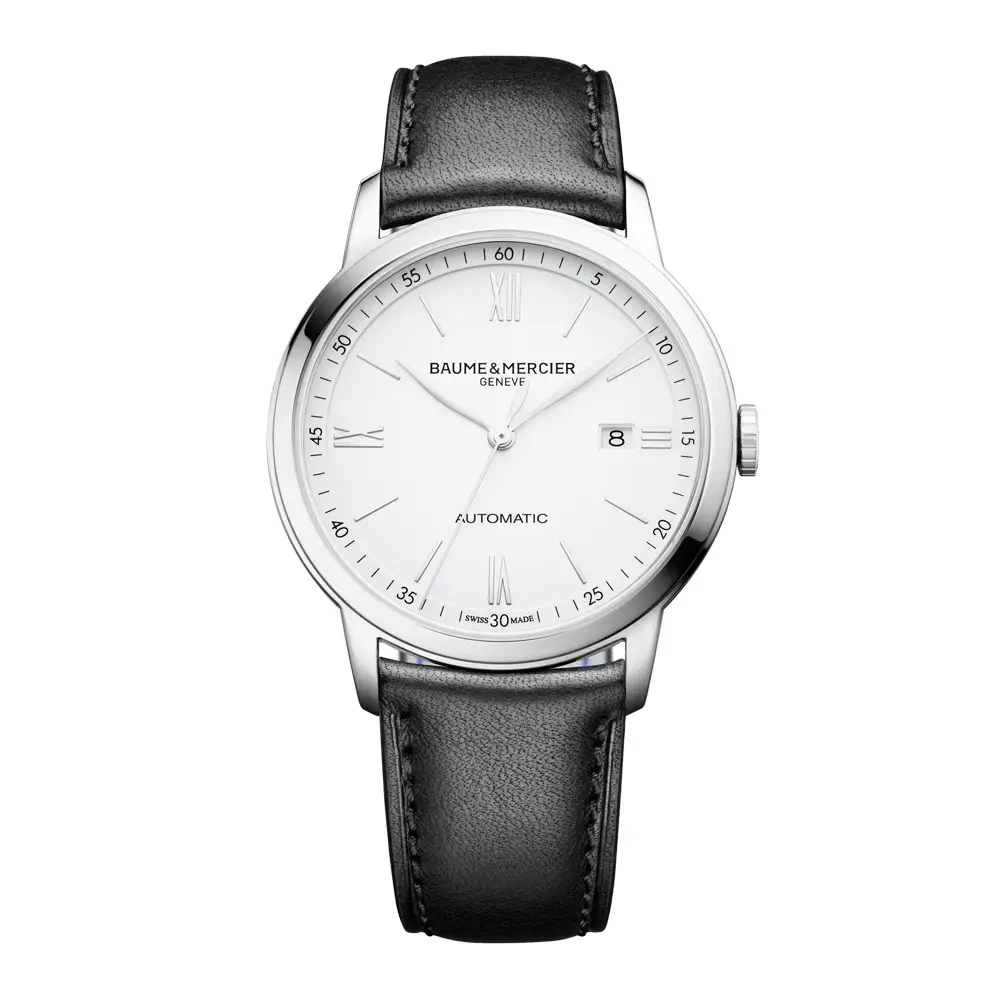 Baume & Mercier Classima M0A10332 blends classic aesthetics with modern refinement. The 42 mm polished stainless steel case houses a white dial with Roman numerals and elegant hands that emphasize balance and harmony. The black calfskin leather strap enhances the watch’s timeless, formal character — perfect for both daily wear and special occasions.