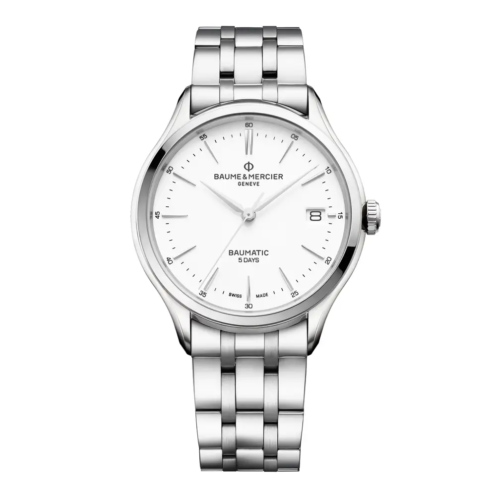 Baume & Mercier Clifton Baumatic M0A10400 represents the perfect harmony between modern technology and timeless elegance. The 40 mm polished stainless steel case surrounds a silver-textured dial with slender indexes, creating a clean and refined aesthetic. The five-link stainless steel bracelet adds sophistication and versatility, making the watch suitable for both formal and everyday wear.
