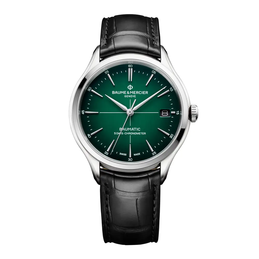 Baume & Mercier Clifton M0A10592 combines timeless elegance with the advanced technology of Swiss watchmaking. The 40 mm polished stainless steel case frames a green gradient dial with crosshair detail and rhodium-plated hands, creating a refined contrast. The black alligator leather strap adds a touch of sophistication and complements the watch’s elegant proportions.