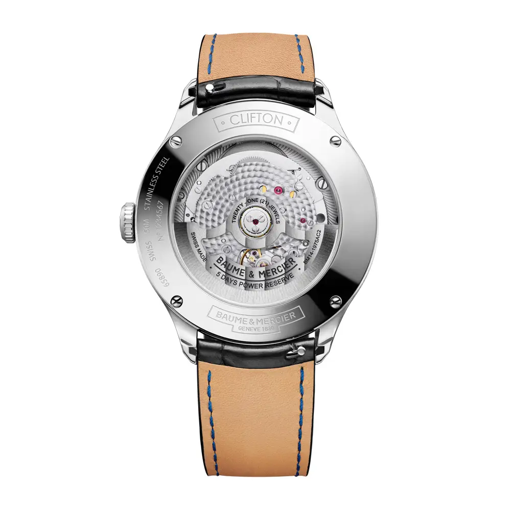 Inside beats the automatic Baumatic calibre BM14-1975A C2, offering a 120-hour (5-day) power reserve and high precision certified to Swiss chronometer standards. The Clifton Baumatic M0A10593 unites technical excellence, refined design, and contemporary Swiss luxury.