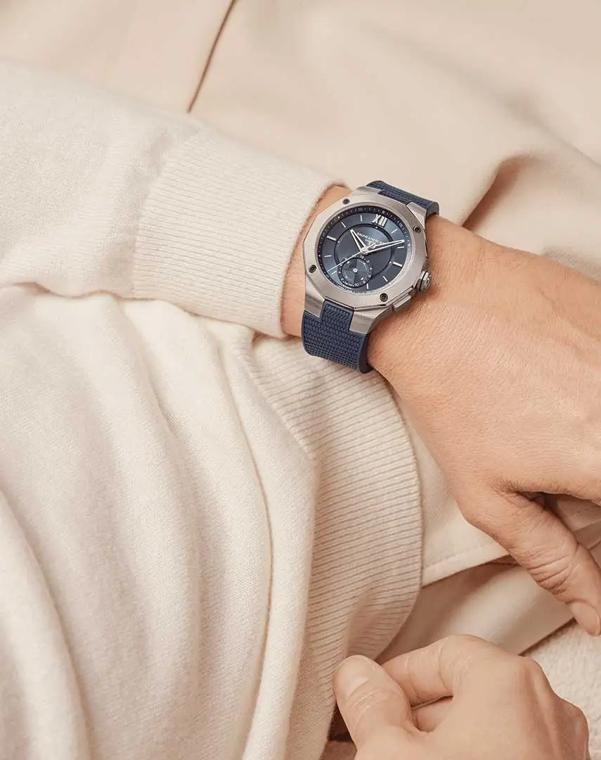 The robust 43 mm round stainless steel case features the distinctive twelve-sided bezel, a signature of the Riviera collection that emphasizes the watch’s unique character. The sapphire crystal protects the elegant blue analog dial, notable for its clean design and clear layout.