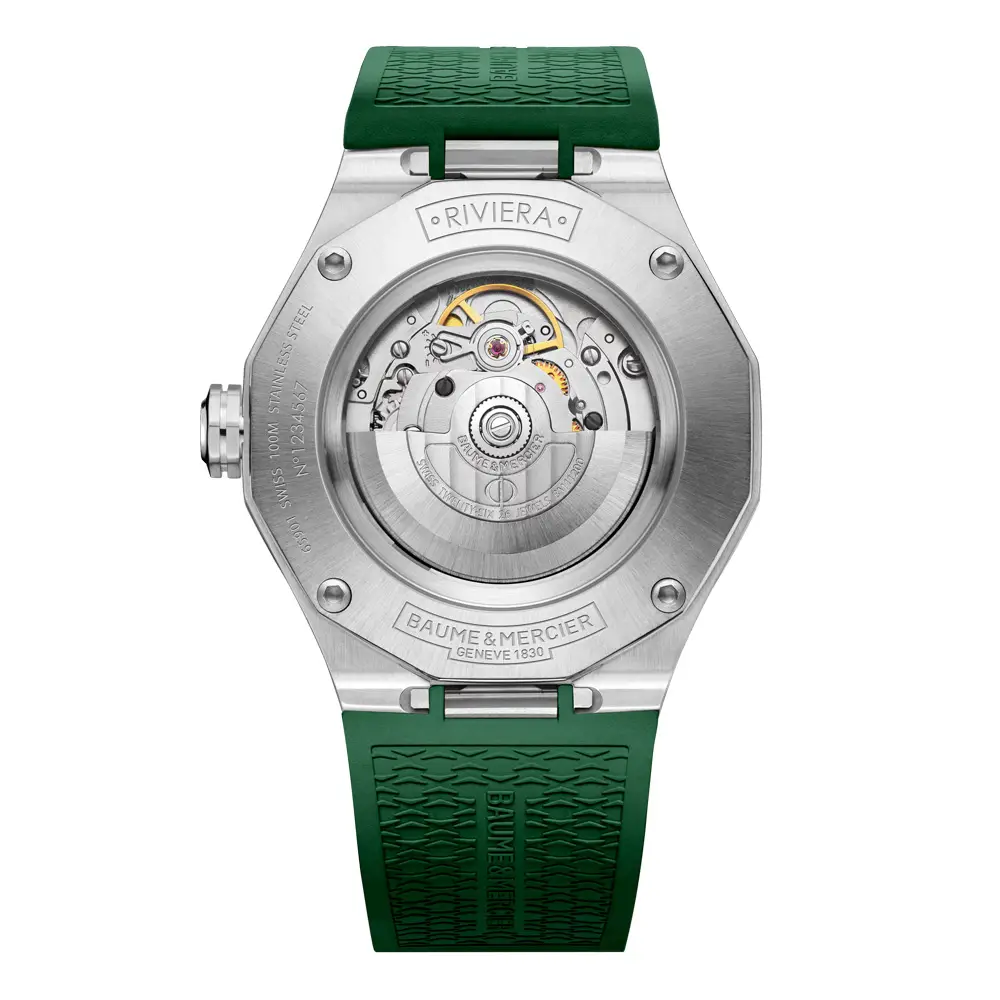 Powered by an automatic mechanical movement, the watch ensures reliable and smooth performance. The green rubber strap with folding clasp complements the sporty look while providing comfort for daily wear. With water resistance up to 10 ATM (100 m), the Baume & Mercier Riviera M0A10618 is ideal for both active lifestyles and refined urban elegance.