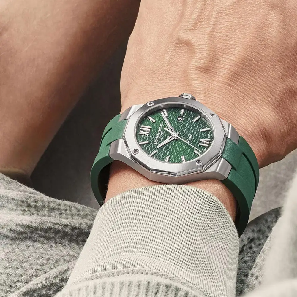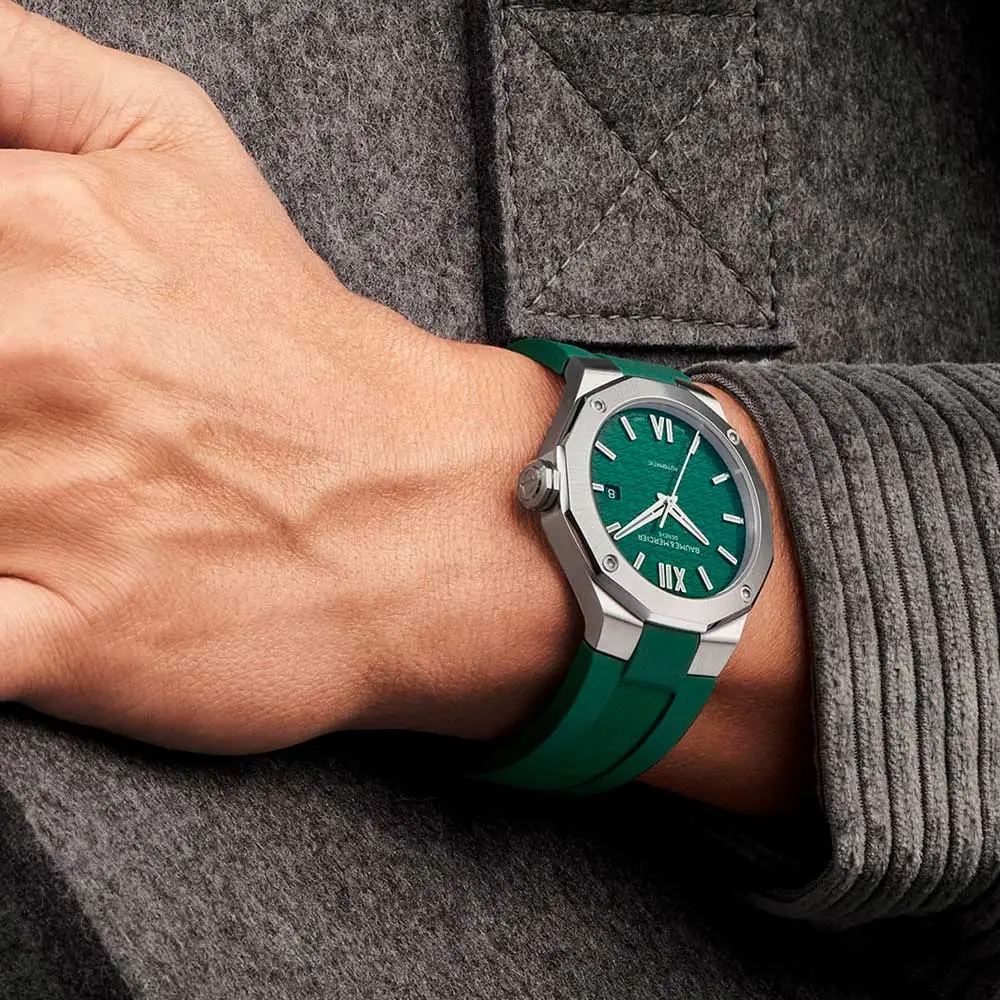 The 42 mm stainless steel case features the signature twelve-sided bezel, giving the watch its instantly recognizable character. The green textured dial, protected by sapphire crystal, includes a date window at 3 o’clock, enhancing everyday practicality.