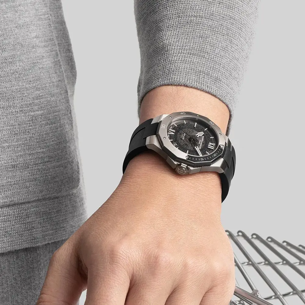 The robust 42 mm round stainless steel case with the signature twelve-sided bezel emphasizes the dynamic and modern look of the watch. The sapphire crystal provides scratch resistance and perfect legibility. The clear skeleton analog dial is complemented by a practical date window discreetly positioned at 3 o’clock.
