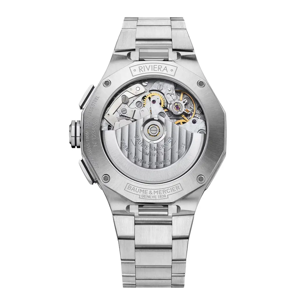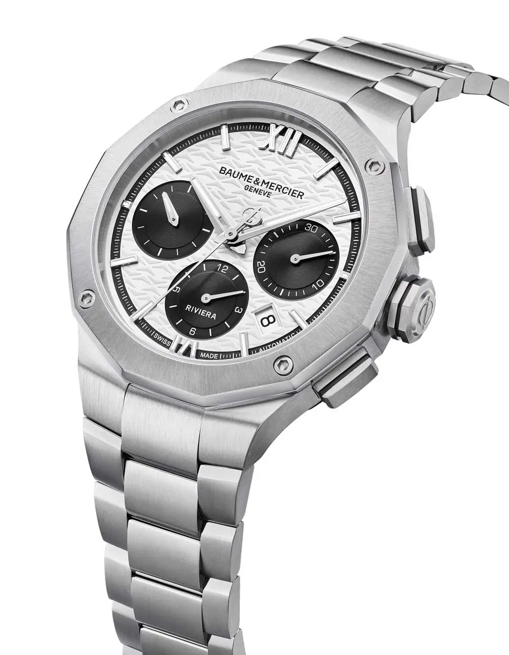 The Baume & Mercier Riviera M0A10827 is a modern reinterpretation of the iconic sporty design from the 1970s. The Riviera collection is known for its characteristic twelve-sided case, which in this design takes on both an elegant and sporty expression thanks to the combination of noble materials and a distinctive dial.