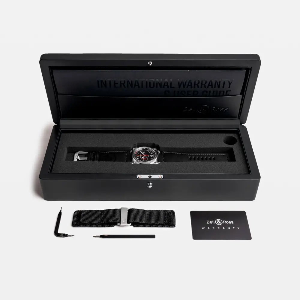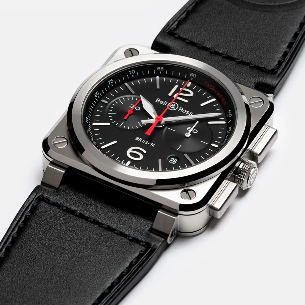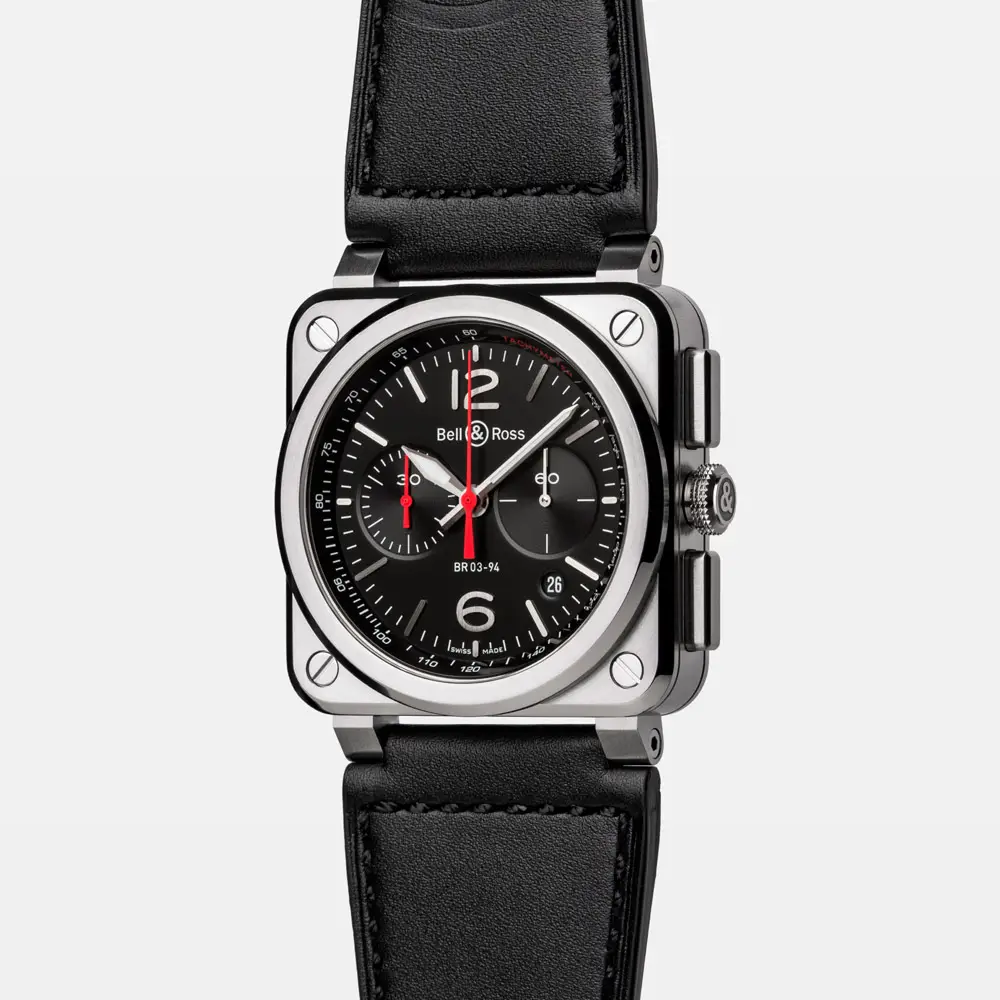 The Bell & Ross BR 03-94 Black Steel (Ref. BR0394-BLC-ST/SCA) is a bold chronograph that combines aviation precision, technical functionality, and the strength of stainless steel. Its design, inspired by aircraft cockpit instruments, reflects the Bell & Ross philosophy — precise, legible, and reliable in every situation.