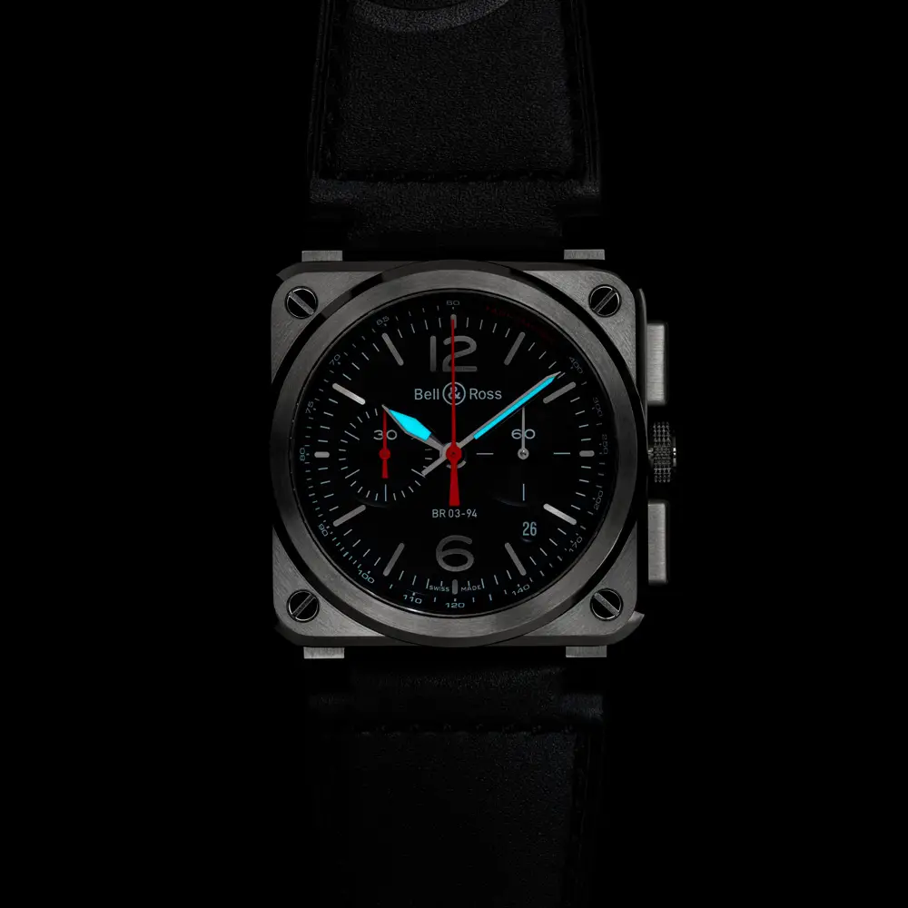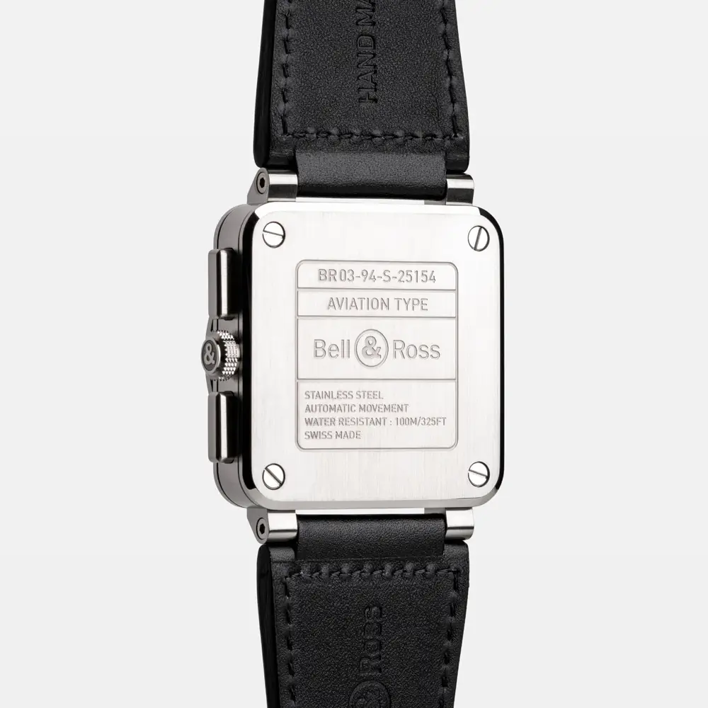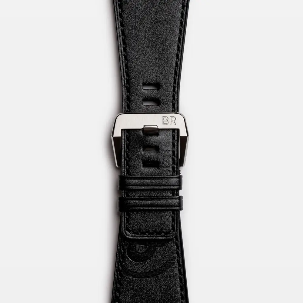 At its core beats the automatic BR-CAL.301 movement, featuring chronograph and date functions with a power reserve of approximately 42 hours. With 100 m (10 ATM) water resistance and a black leather strap with pin buckle, the BR 03-94 Black Steel achieves the ideal balance between elegance, performance, and durability.