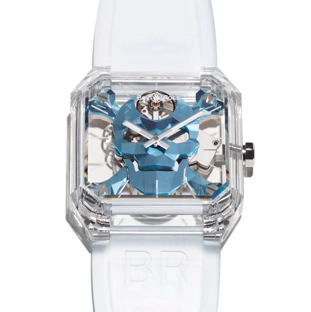 The Bell & Ross BR01-CSKBLU-SAPHIR is a daring masterpiece of modern haute horlogerie, blending innovation, transparency, and avant-garde aesthetics. Its faceted case made entirely of clear sapphire crystal immediately captures attention, revealing the intricate inner workings. At its center stands a striking blue steel skull, the emblematic symbol of the Cyber Skull collection.