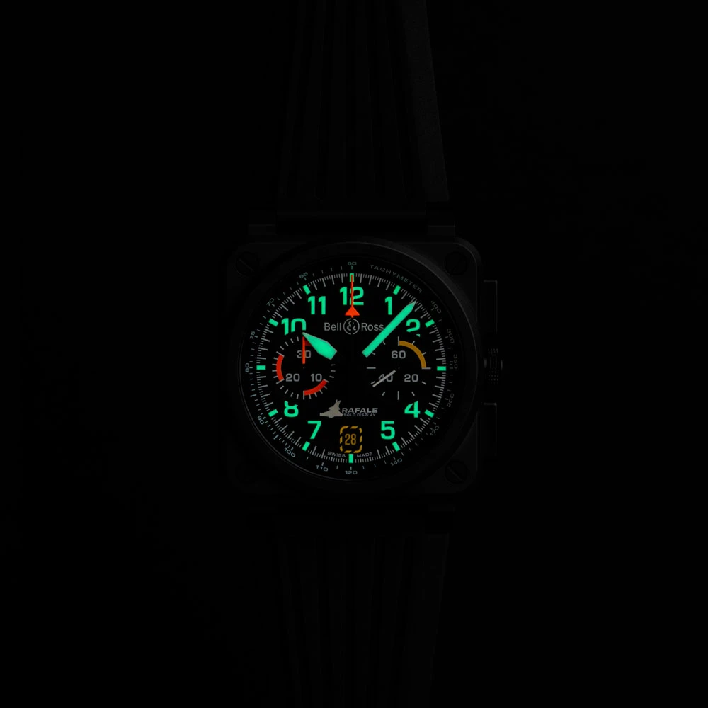 Inside beats the reliable automatic BR-CAL.301 chronograph movement, offering a power reserve of up to 42 hours. The matte black dial features bold white luminous Arabic numerals, contrasting orange chronograph hands, and a subtle silhouette of the Rafale jet on the seconds hand – a refined nod to the partnership.