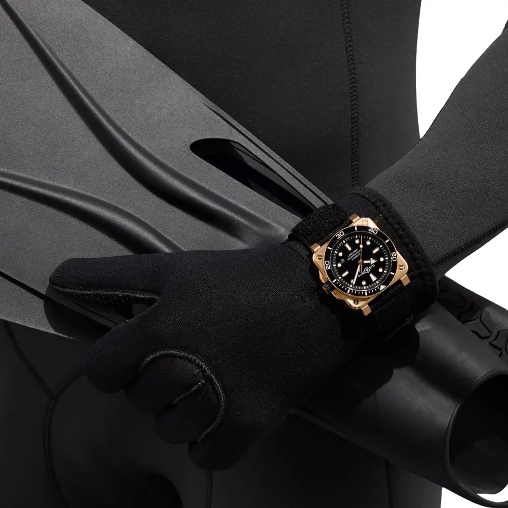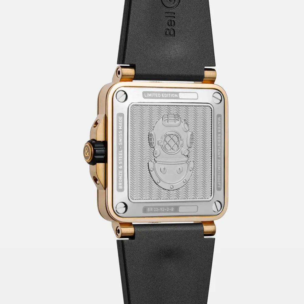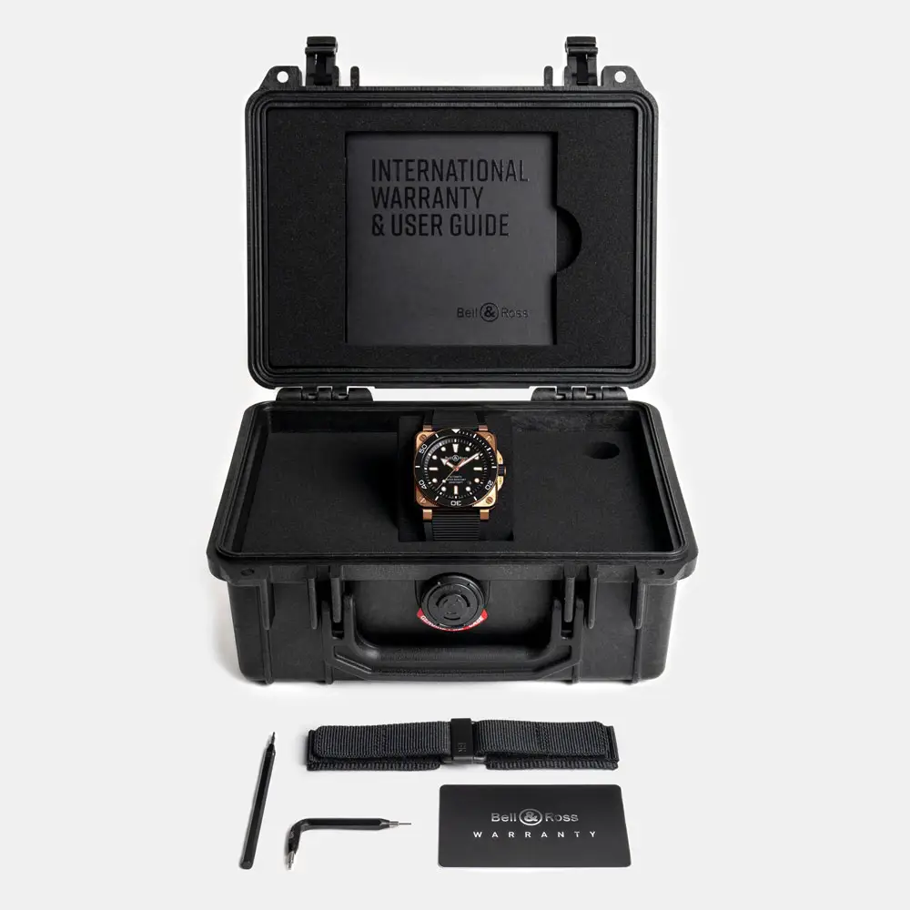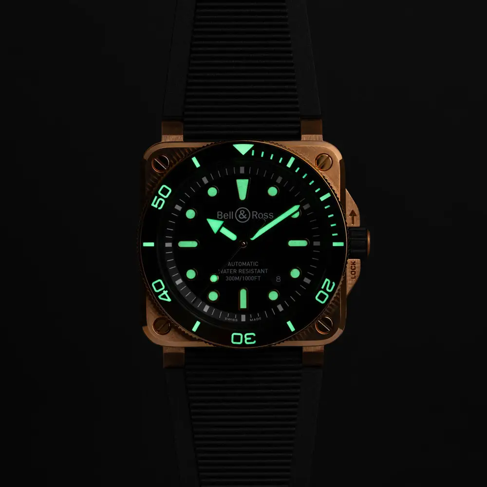 The Bell & Ross BR 03 Diver Black Bronze combines professional diving performance with an iconic design inspired by aviation instruments. The 42 mm bronze case (CuSn8 alloy) develops a unique patina over time, making each piece truly individual. The signature square shape is complemented by a unidirectional rotating bezel with black ceramic insert, a screw-down crown, and water resistance of 300 m (ISO 6425), ensuring full diving capability.