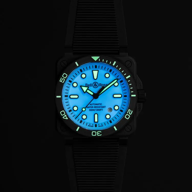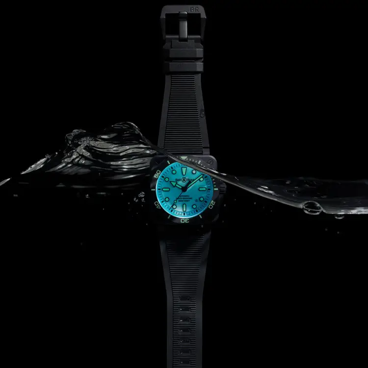 The Bell & Ross BR 03 Diver Full Lum Ceramic represents the perfect fusion of professional functionality, cutting-edge innovation, and modern design. Thanks to its fully luminescent dial, the watch remains perfectly legible even in total darkness — making it ideal for night dives and deep-sea adventures.