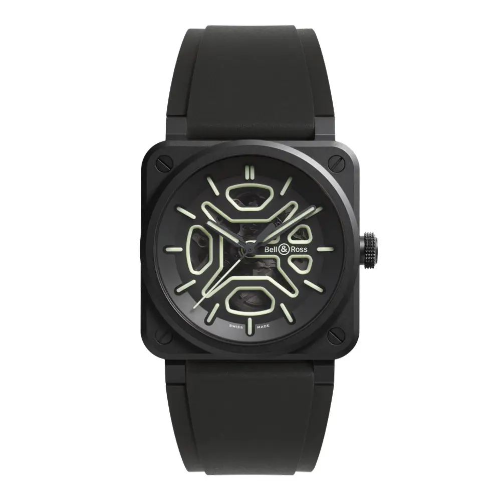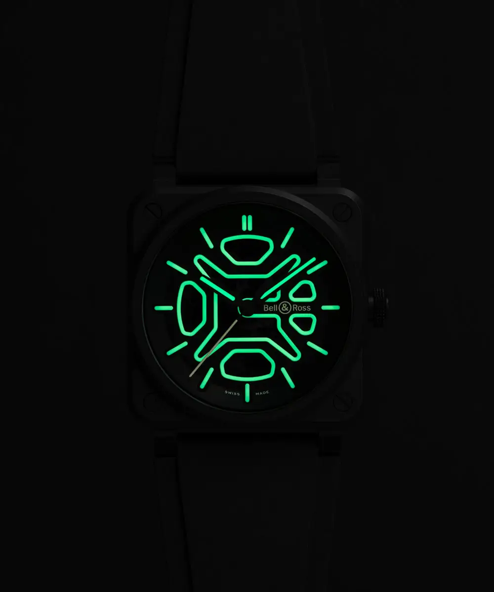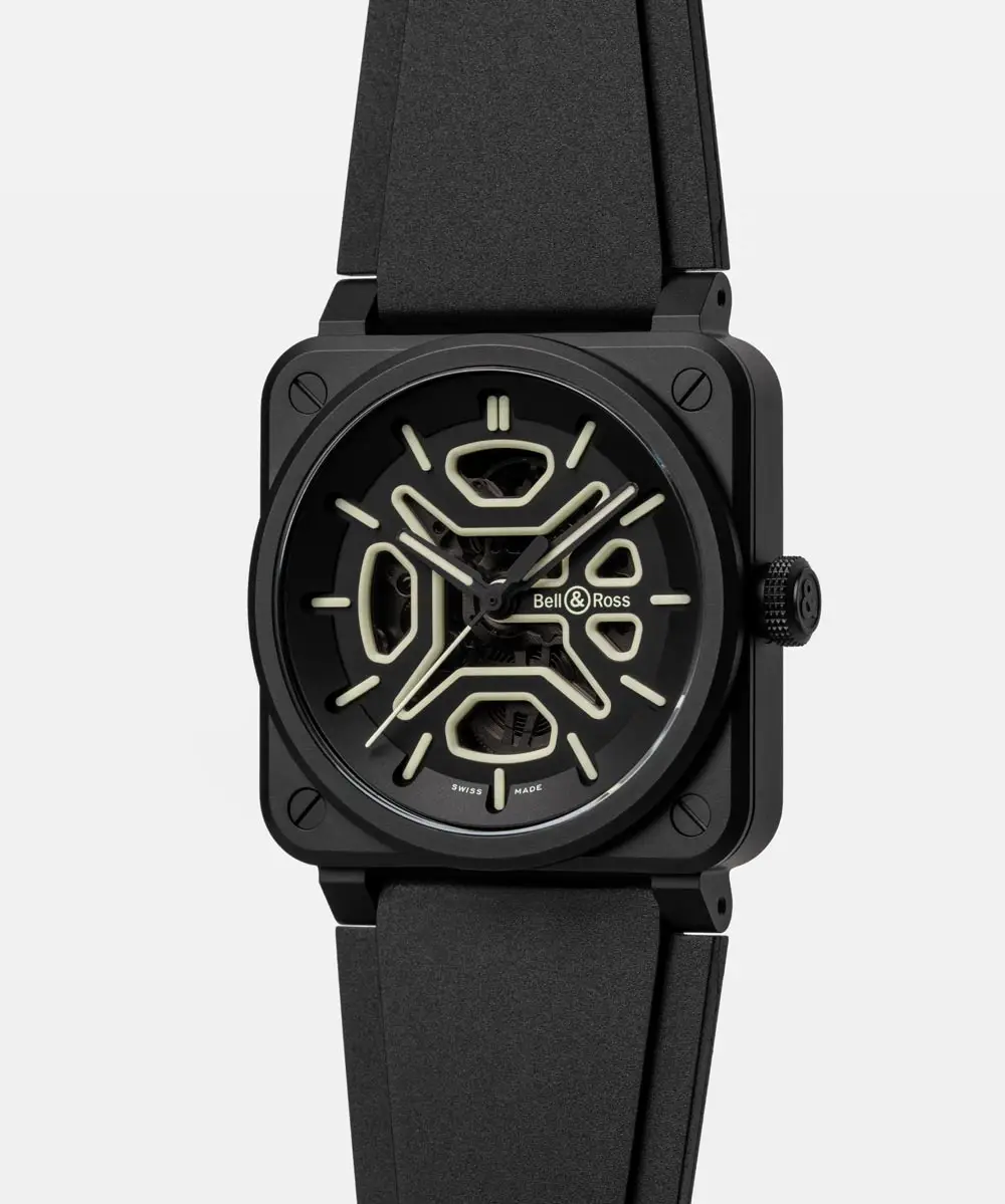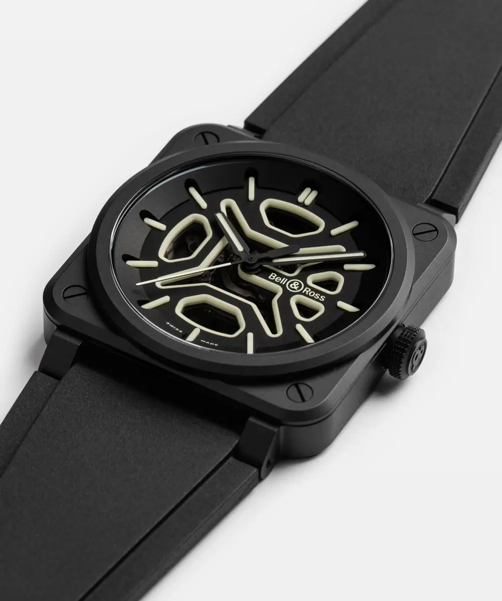 The model is limited to 250 pieces and comes on a black rubber strap with the option of exchanging it for a Velcro strap inspired by professional aviation. The BR-03 Skeleton Lum Ceramic is a distinctive collector's piece that combines cutting-edge watchmaking with Bell & Ross' bold and unmistakable style.