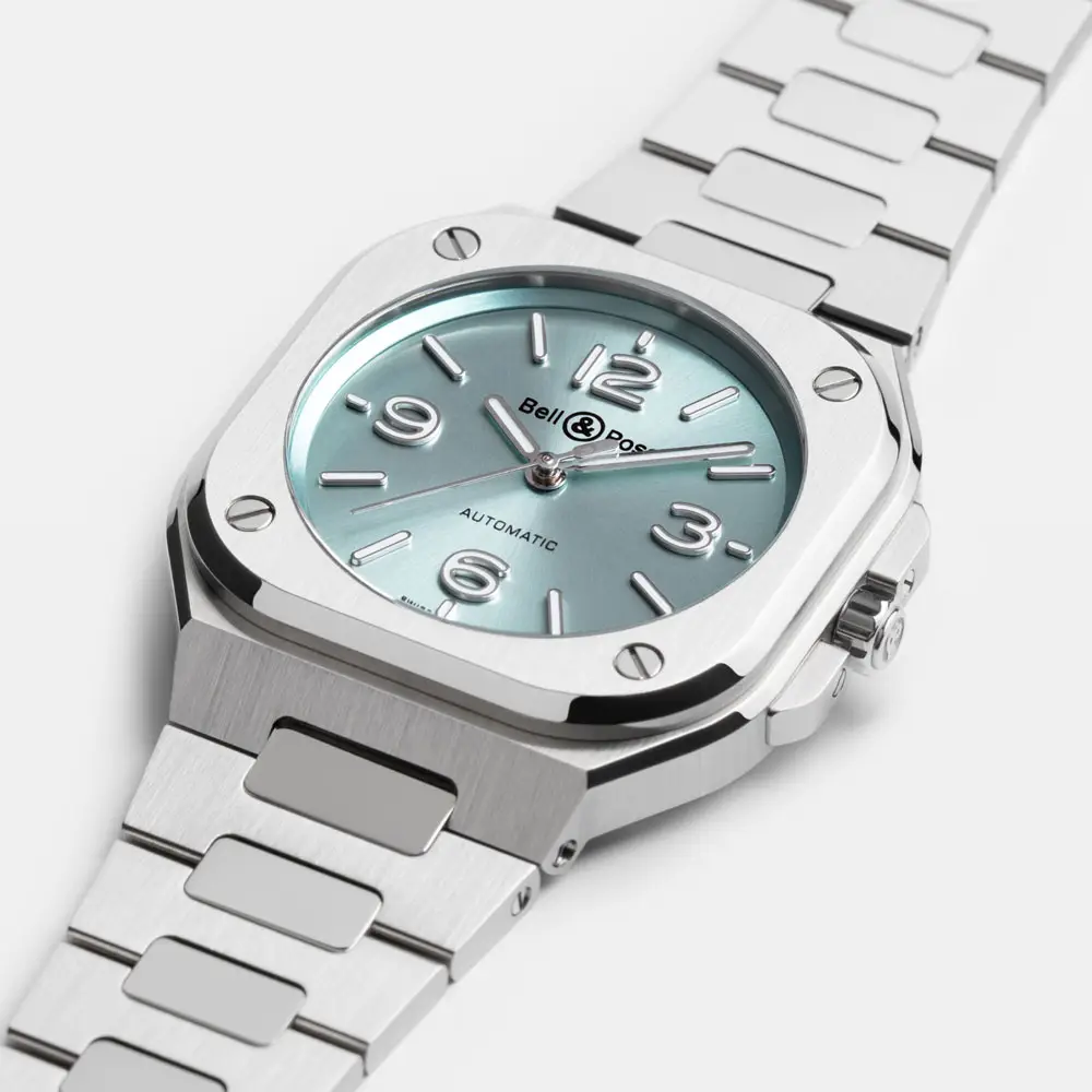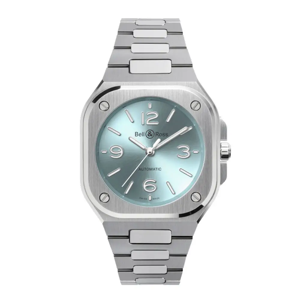 The Bell & Ross BR 05 Blue Steel (BR05A-S-BU-ST/SST) embodies modern urban style and rugged elegance. Its square 40mm case with integrated bracelet combines polished and satin-brushed surfaces, drawing on the brand's iconic industrial design inspired by aeronautical instruments.