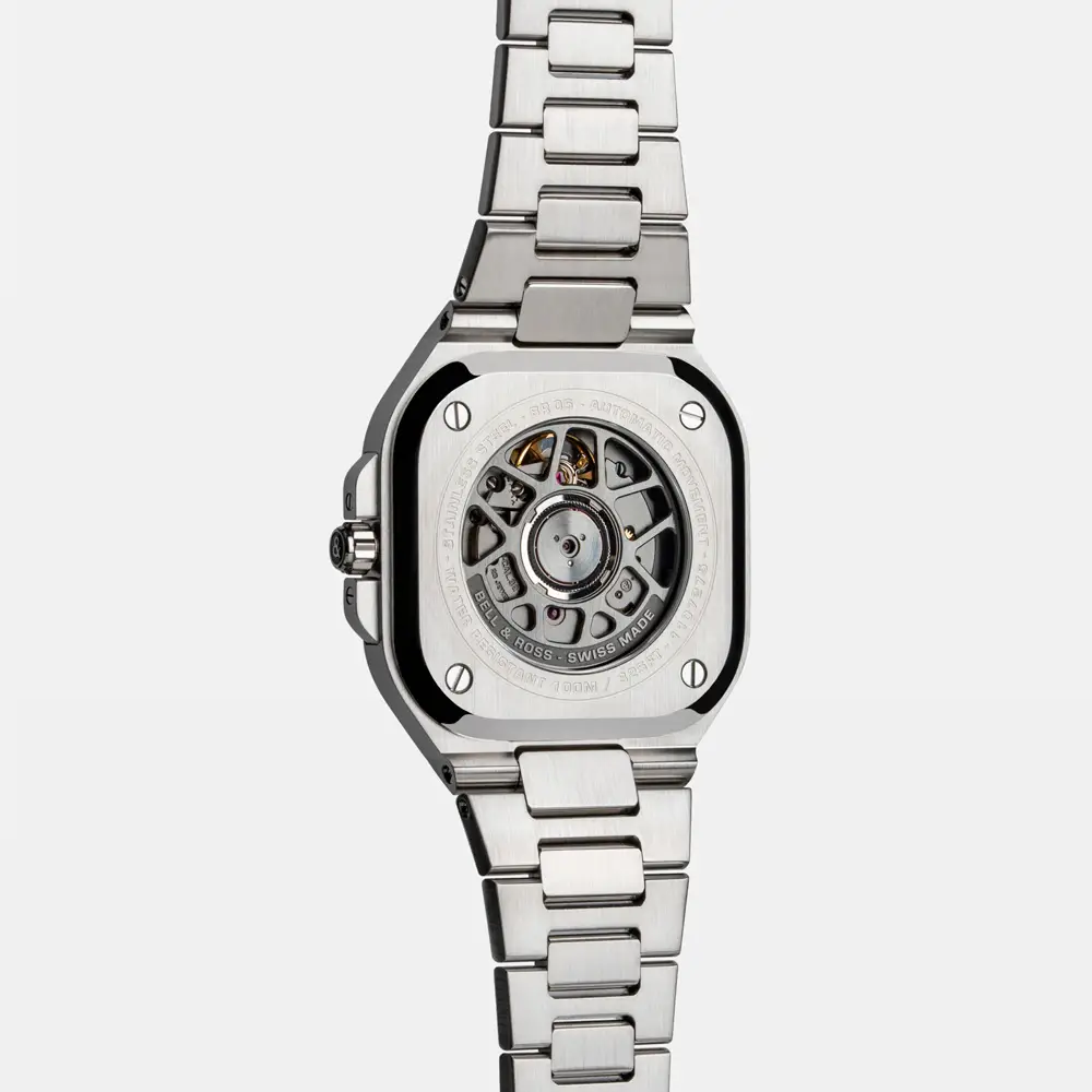 The 40 mm polished and satin-finished stainless steel case flows seamlessly into the integrated steel bracelet, creating a harmonious and compact silhouette. Anti-reflective sapphire crystal protects the black sunray dial, which offers excellent legibility and a sleek contrast. Every detail reflects the distinctive industrial aesthetic of Bell & Ross.