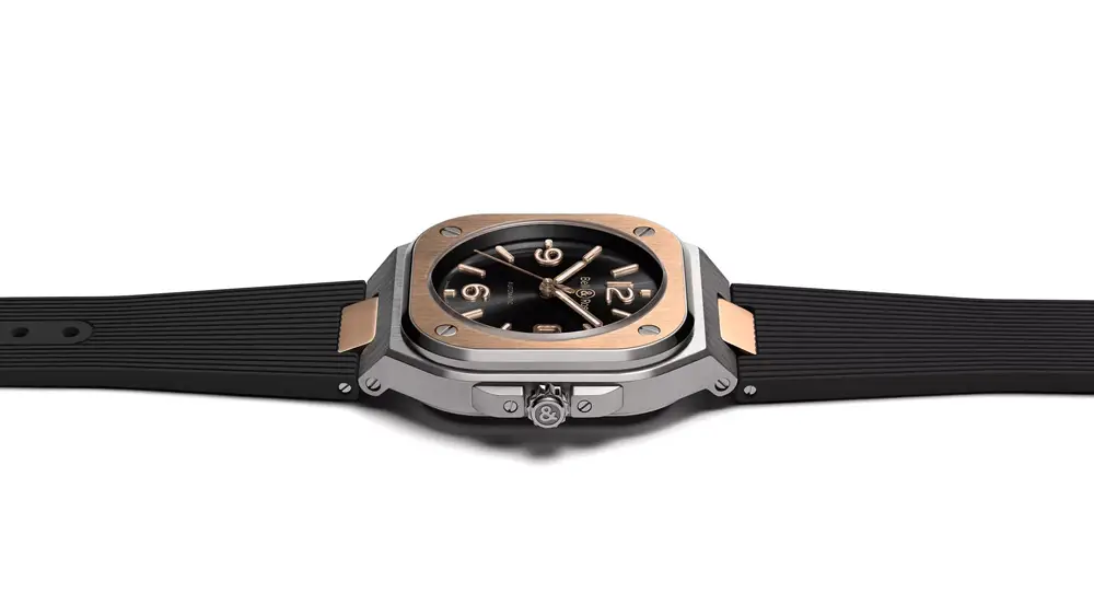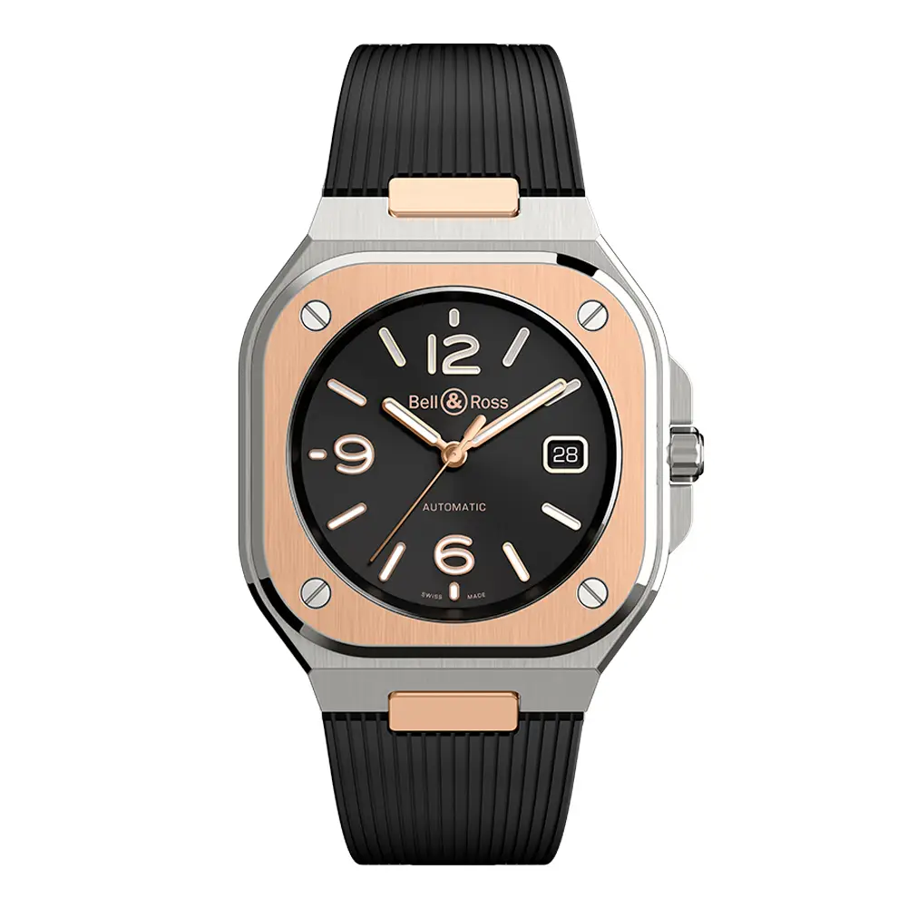 Bell & Ross BR 05 Black Steel & Gold is a bold and elegant timepiece that blends the strength of stainless steel with the refined luxury of 18K rose gold. This model from the BR 05 collection is designed for the modern man seeking both technical precision and sophisticated style.