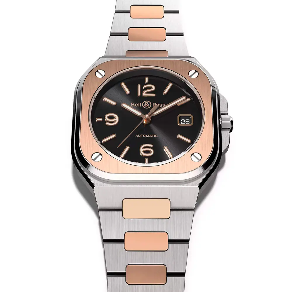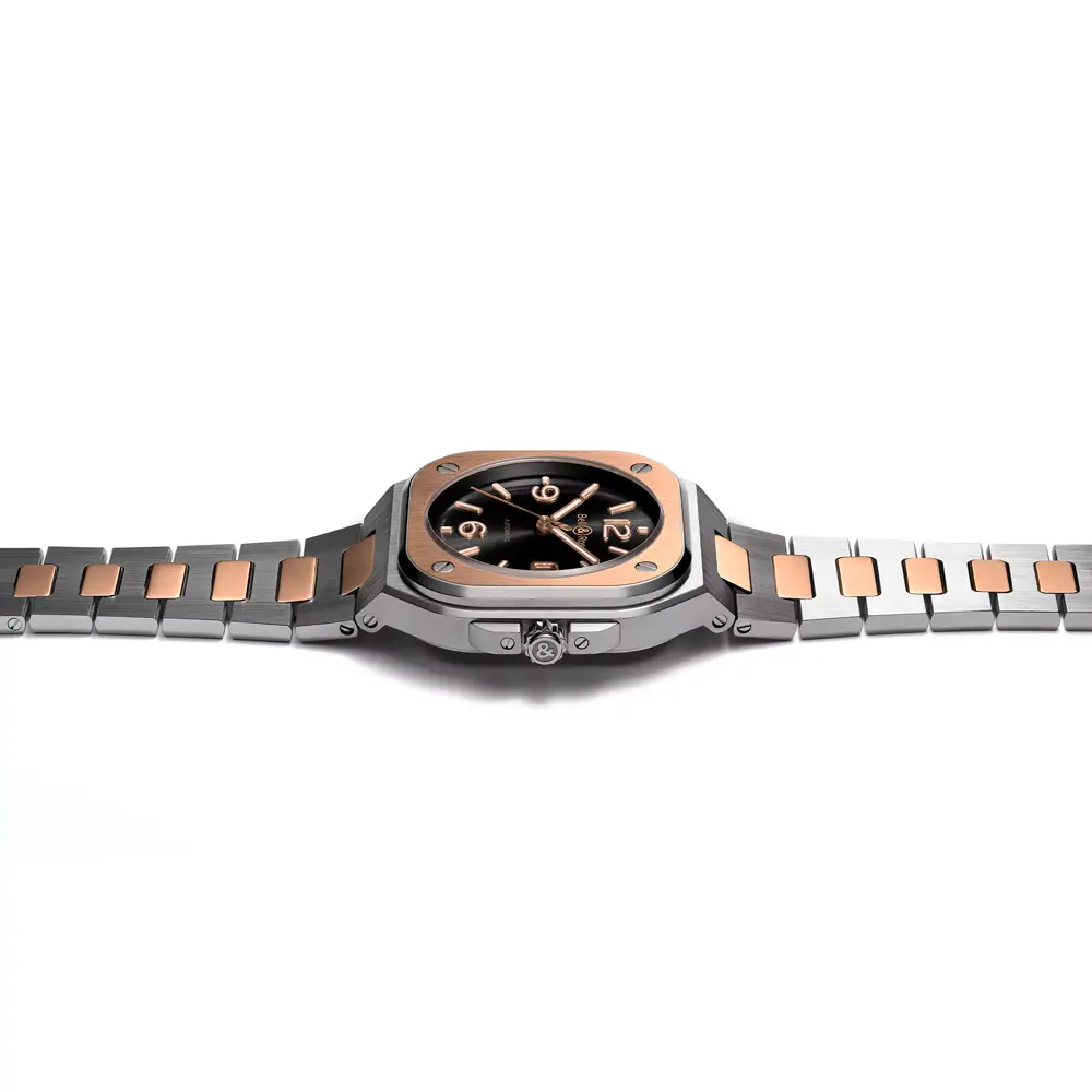 Bell & Ross BR 05 Black Steel & Gold combines refined design with expert watchmaking. With its 40 mm round case made of stainless steel and a luxurious 18K rose gold bezel, it offers a perfect blend of elegance and modern sophistication.