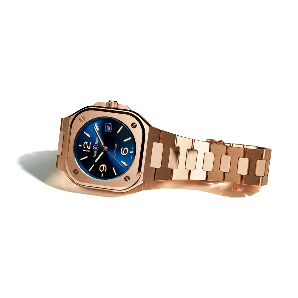 The Bell & Ross BR 05 Blue Gold (Ref. BR05A-BLU-PG/SRB) embodies the perfect harmony of luxury and technical sophistication that defines the BR 05 collection. This model combines the warm glow of 18K rose gold with an elegant blue sunray dial, creating a refined balance between sporty style and timeless elegance.
