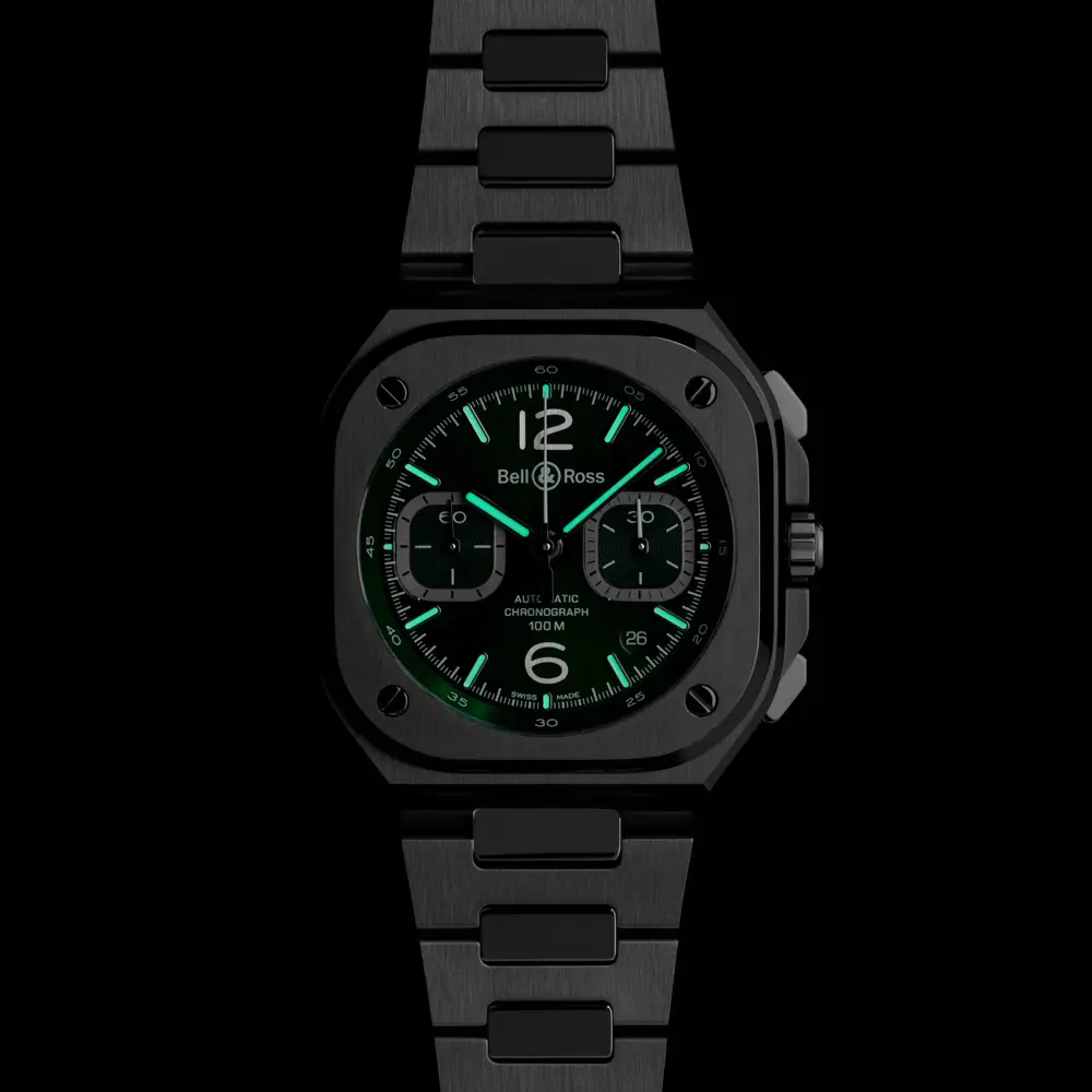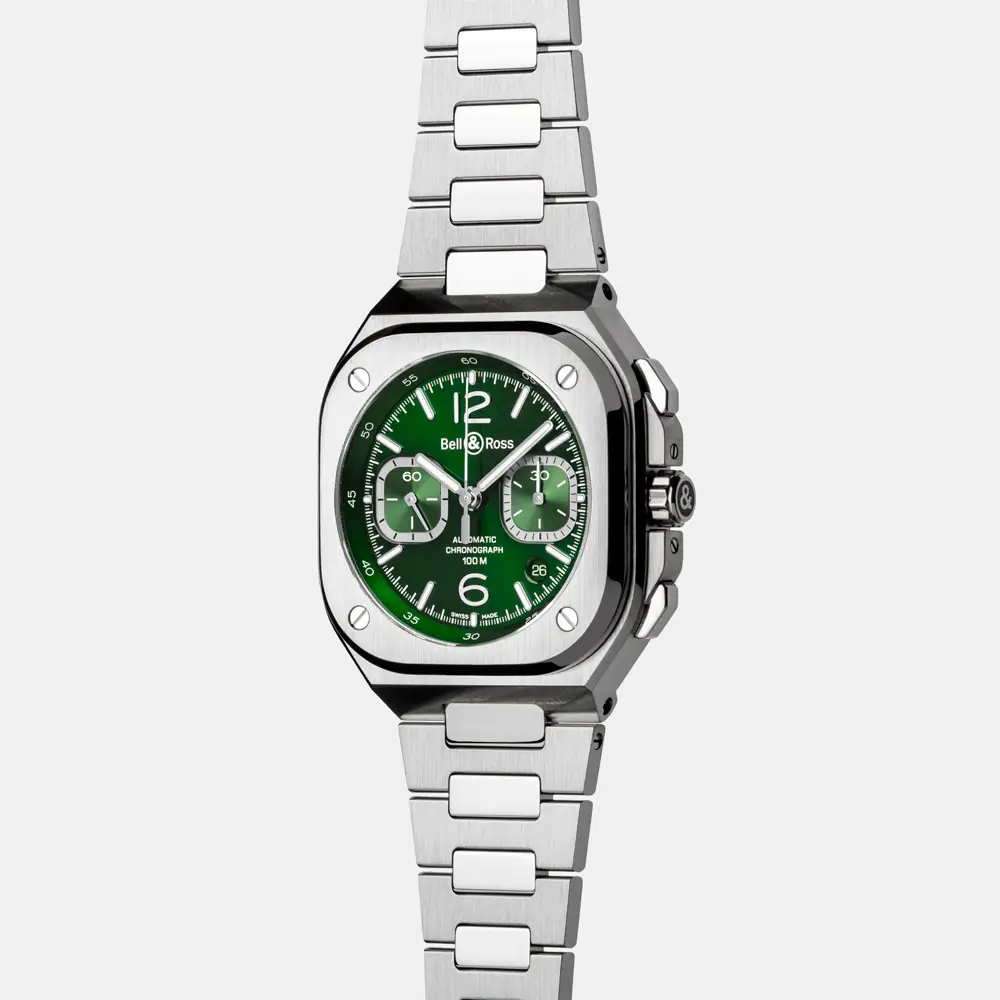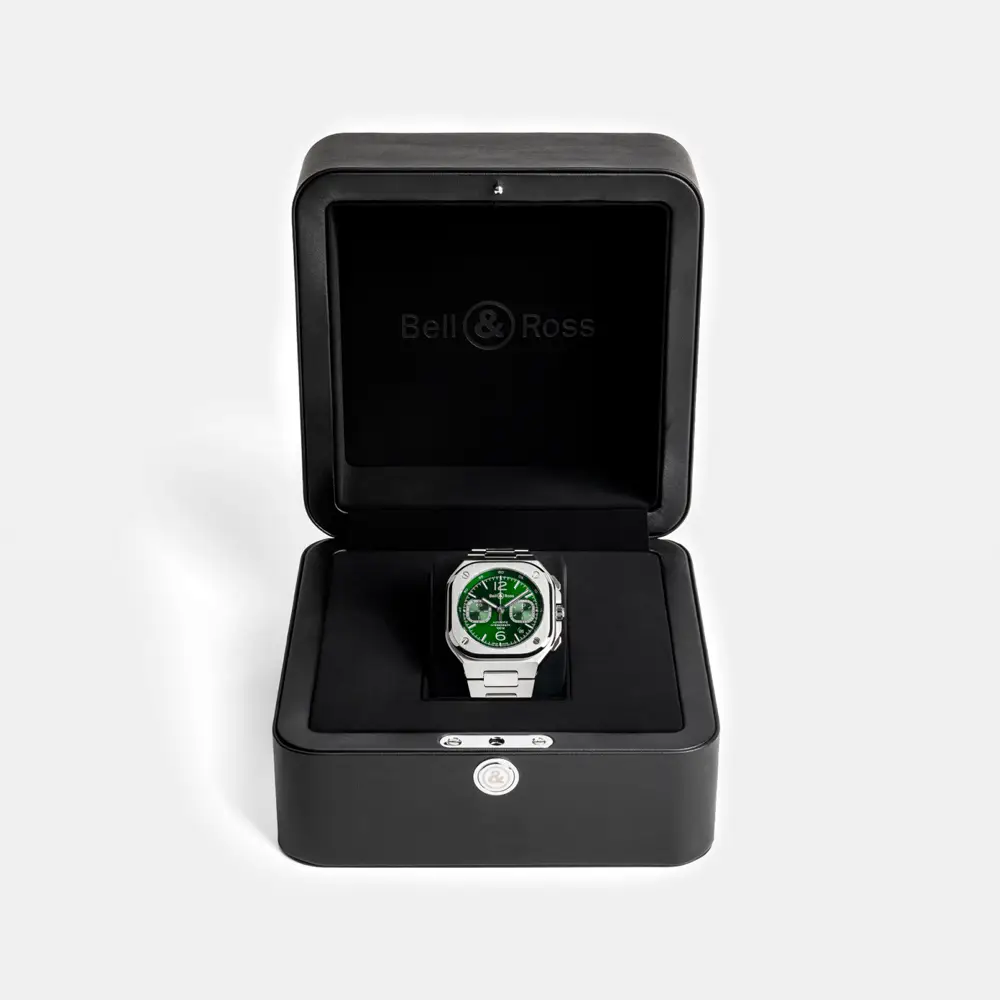 Powered by an automatic chronograph movement with a date display between 4 and 5 o’clock, it offers precision and everyday reliability. The stainless steel bracelet with folding clasp provides comfort and continuity in style, complemented by 100 m (10 ATM) water resistance. The BR 05 Chrono Green Steel is the perfect balance between sport and elegance, designed for both daily wear and formal occasions.