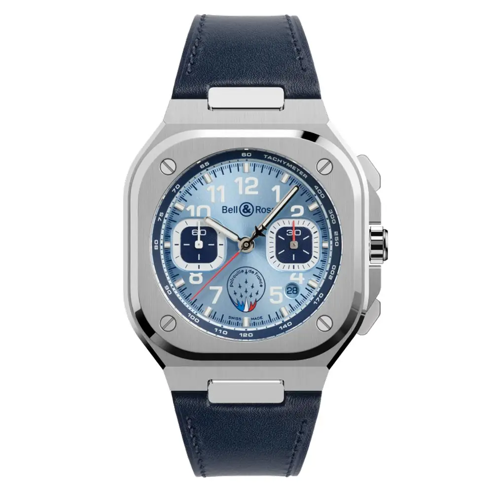 The Bell & Ross BR 05 Chrono Patrouille de France (Ref. BR05C-PAF-ST/SCA) is a limited edition celebrating the partnership between Bell & Ross and the elite aerobatic team Patrouille de France. It blends sporty elegance with aviation heritage, expressing both technical precision and the spirit of flight.