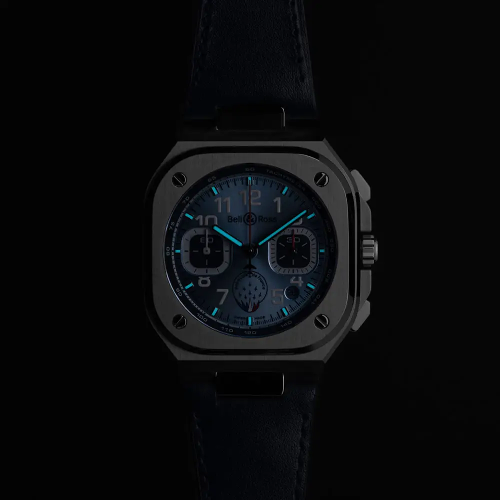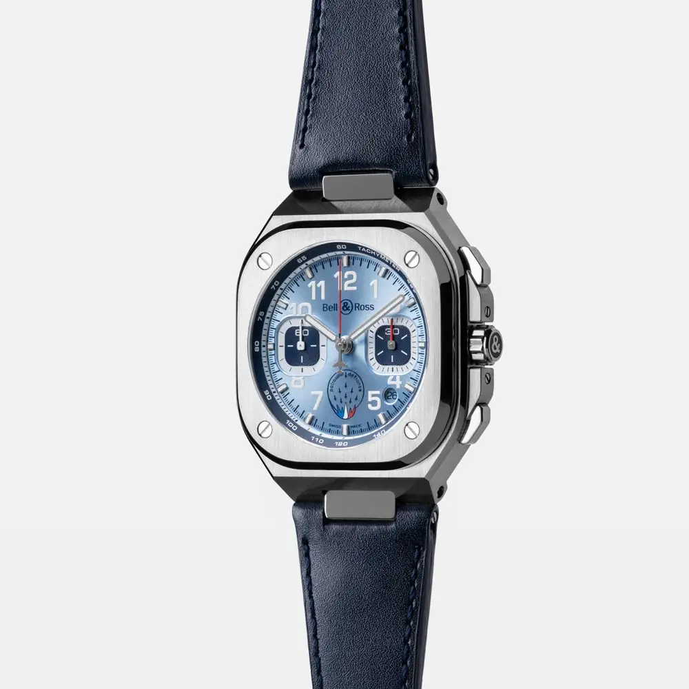 Inside beats the automatic BR-CAL.326 movement with a 60-hour power reserve, offering chronograph, small seconds, and date functions. The watch comes with a blue leather strap featuring tricolor stitching and 100 m (10 ATM) water resistance. Limited to 500 pieces, the BR 05 Chrono Patrouille de France represents a perfect balance of performance, elegance, and aviation spirit.