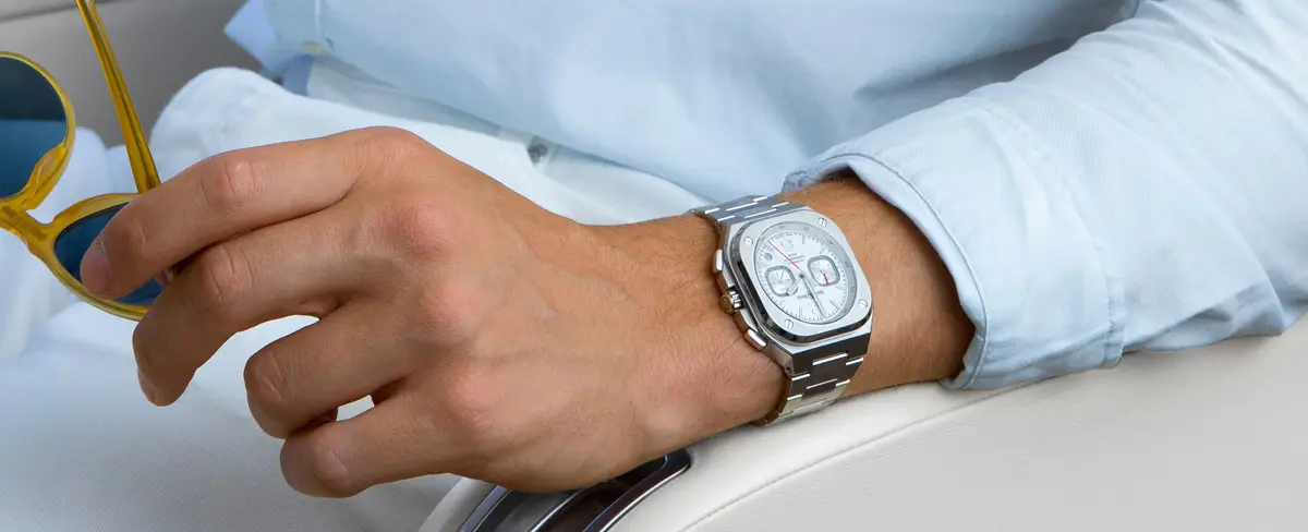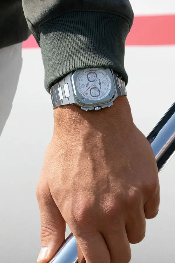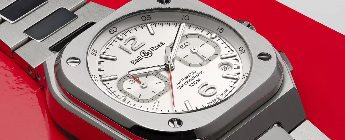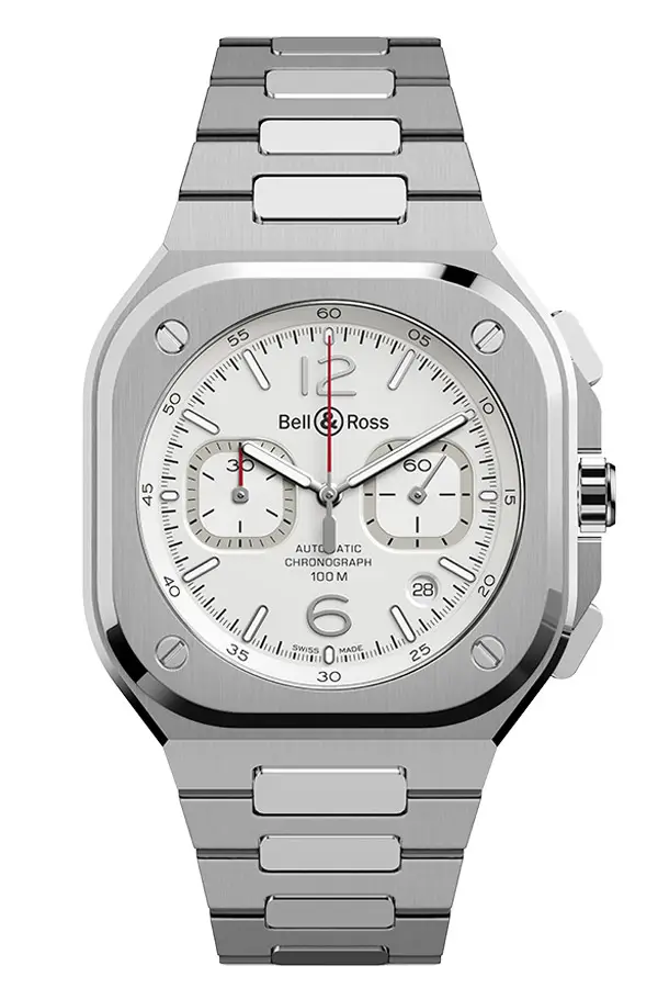 Bell & Ross BR 05 Chrono White Hawk combines robust design with functional elegance and Swiss watchmaking precision. The 42 mm square stainless steel case offers a modern and bold presence.