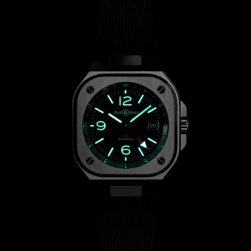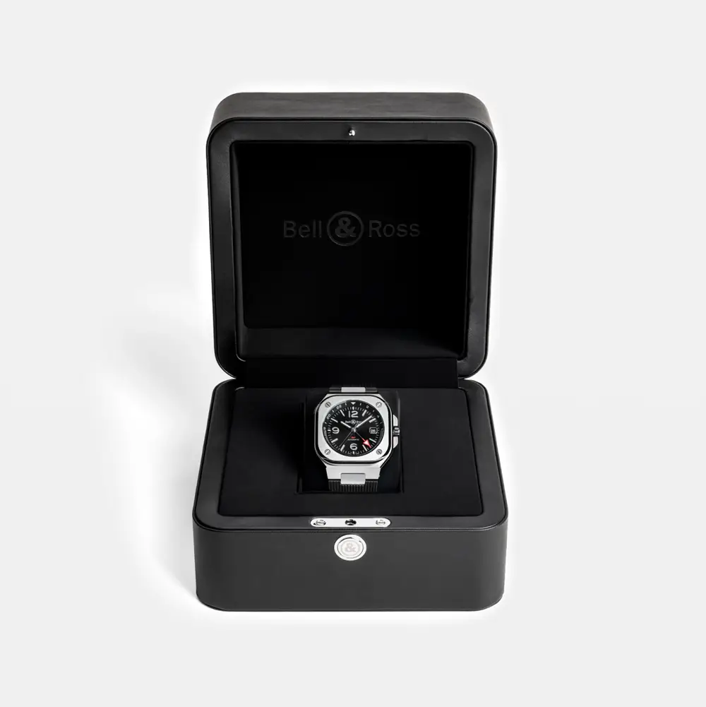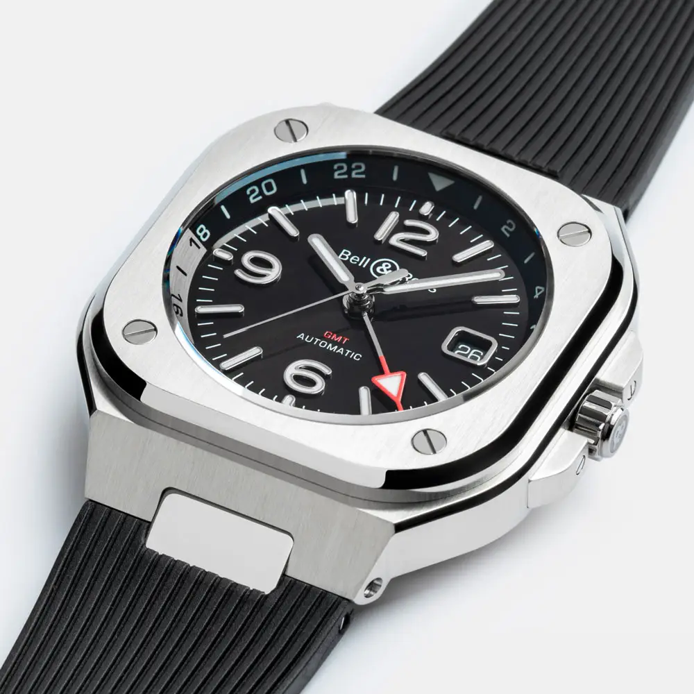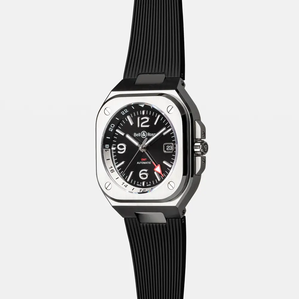 The Bell & Ross BR 05 GMT combines elegant design with practical features. Its 41 mm square stainless steel case makes a strong, robust impression, while the black analog dial with a red GMT hand allows easy reading of a second time zone.