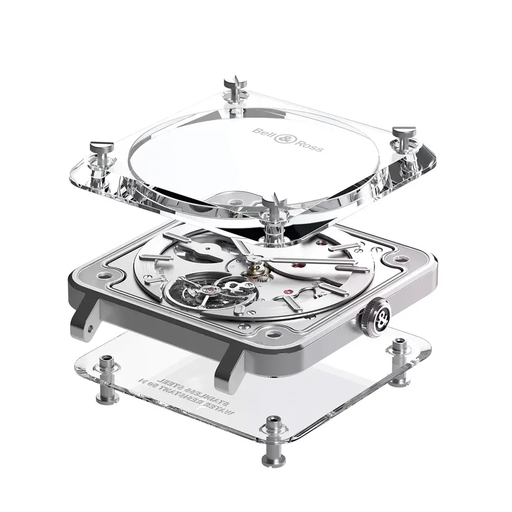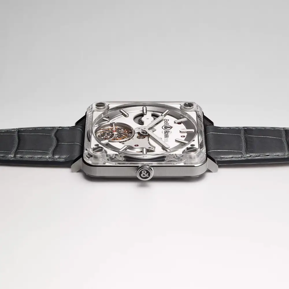 The Bell & Ross BR-X2 Tourbillon Micro-Rotor BRX2-MRTB-ST represents the pinnacle of innovation and avant-garde design. Its 42.5 mm case made of stainless steel and sapphire crystal creates the illusion that the movement is suspended between two glass plates, offering a fascinating view of the complication and architecture of the watch. The transparent construction highlights the modern technical character of this unique timepiece.