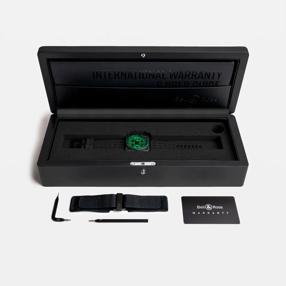 The Bell & Ross BR-X3 Night Vision (ref. BRX3R-GN-CA/SRB) represents a futuristic interpretation of Bell & Ross’s iconic aviation aesthetic, designed for connoisseurs and enthusiasts of cutting-edge technology. This limited edition of 250 pieces captivates with a bold design that fuses innovative materials and Swiss watchmaking excellence.