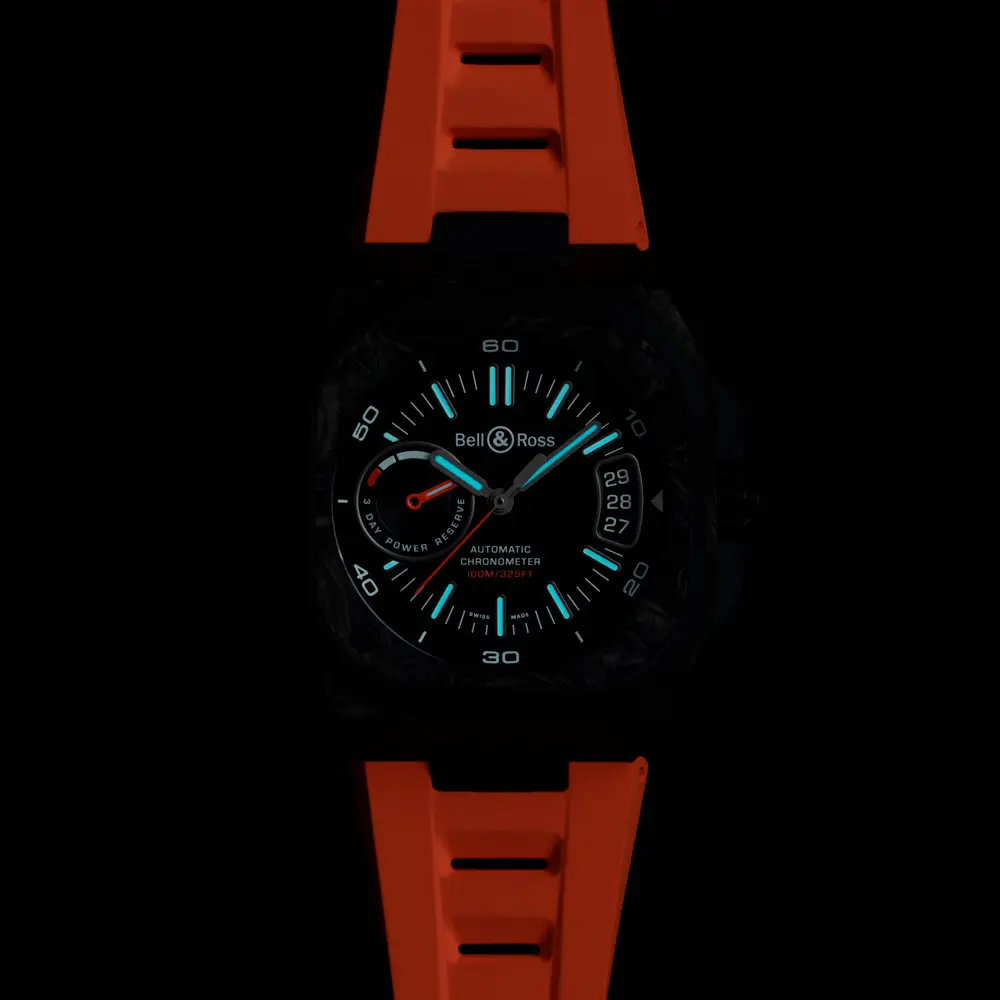 The Bell & Ross BR-X5 Carbon Orange (BRX5R-BO-TC/SRB) delivers a bold sporty spirit combined with advanced engineering. Its 41 mm titanium case with DLC coating is reinforced with carbon fiber inserts, creating a robust yet lightweight design. A sapphire crystal with anti-reflective coating ensures clarity, while the vibrant orange rubber strap adds striking contrast.