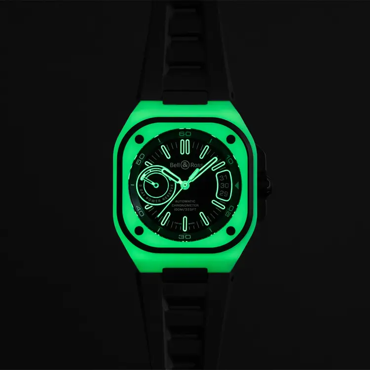 At its core is the automatic BR-CAL.323 movement, developed with Kenissi, delivering a 70-hour power reserve and outstanding precision. The black rubber strap with folding clasp enhances its sporty character, while 100 m (10 bar) water resistance ensures reliability in all situations. Bell & Ross BR-X5 Green Lum is a technical masterpiece with a bold personality – for those who want more than just a watch.