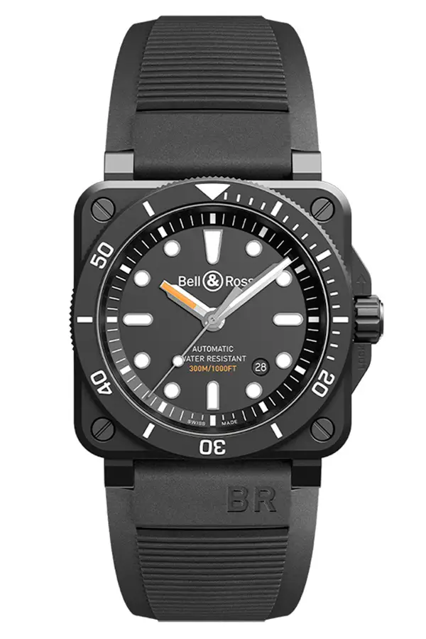Robust men's sports watch from the luxury brand Bell & & Ross from the Instruments collection, which is water resistant to a depth of 300 m, so it will not disappoint any water sports enthusiast. The square dial is set in a ceramic case and protected by a sapphire crystal. The lunette is made of steel and black PVD and black rubber strap.