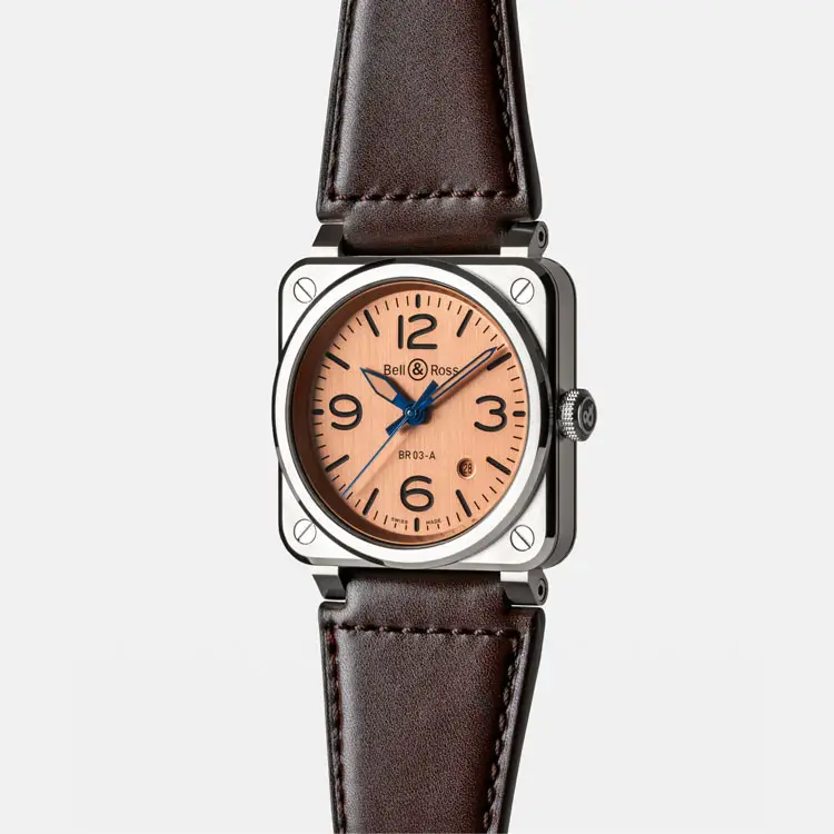 The Bell & Ross BR 03 Copper blends industrial design with warm luxury, highlighted by its distinctive polished copper-toned dial. This striking timepiece appeals to men who appreciate originality, timeless style, and a watch with real character.