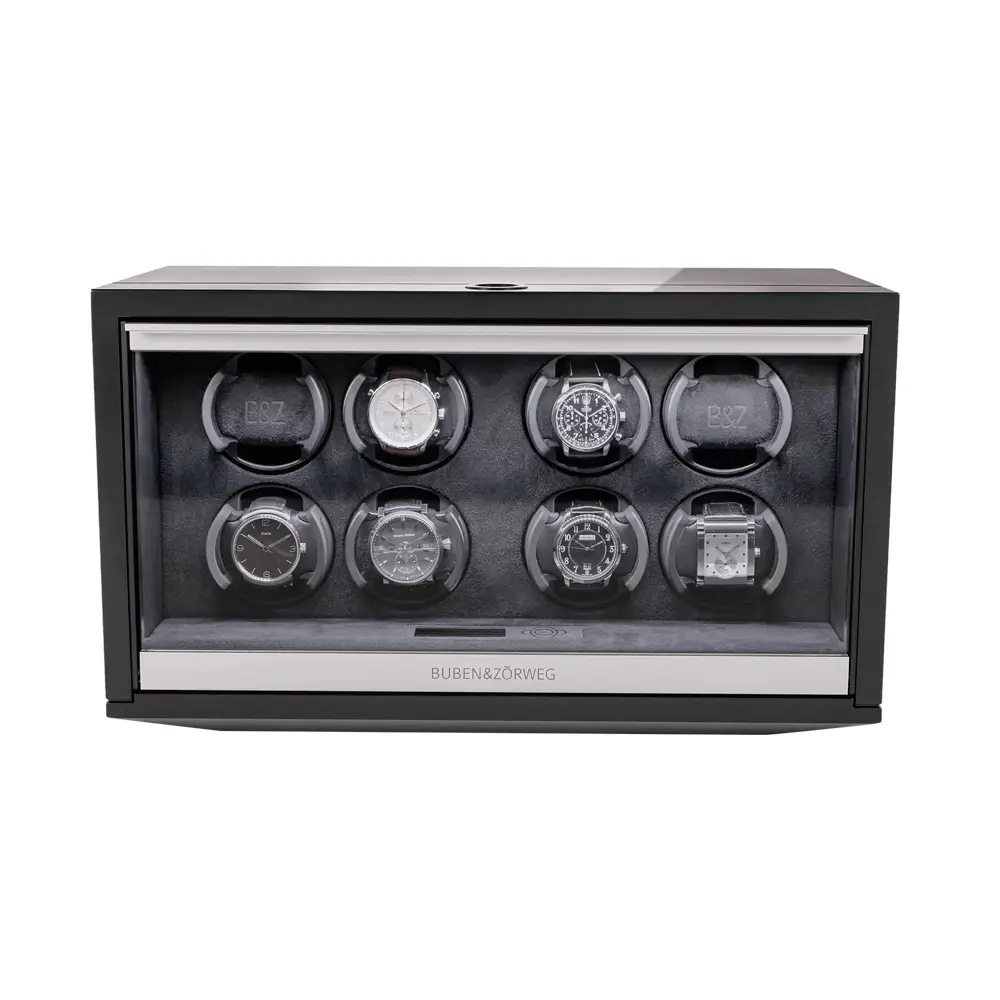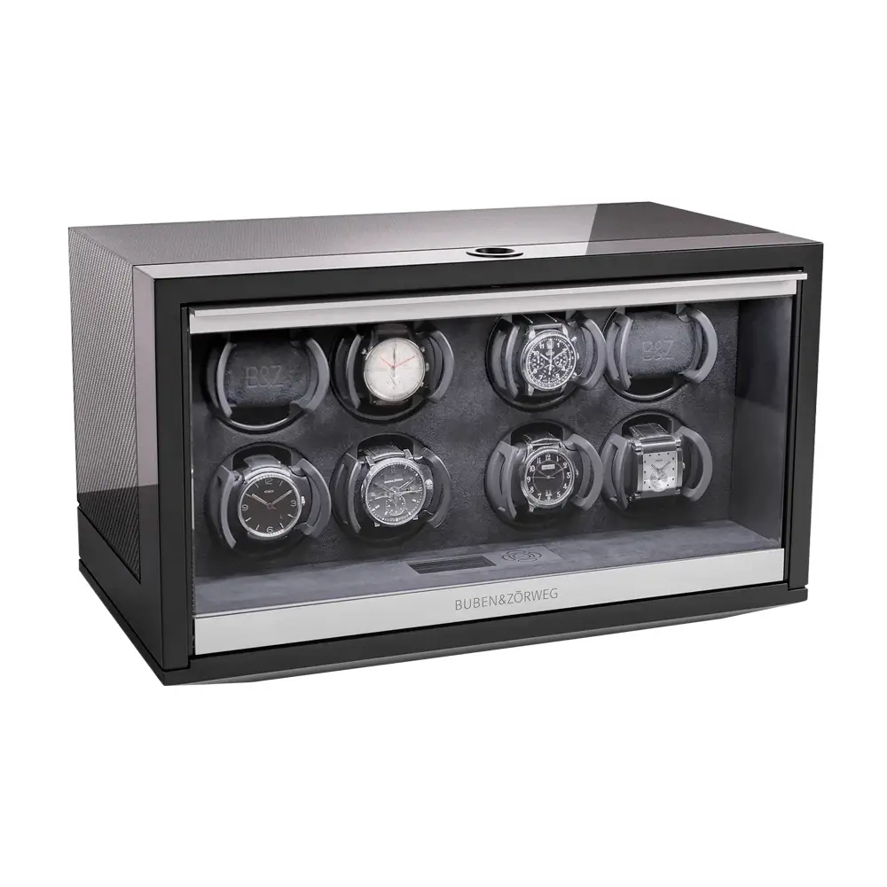 The Buben & Zorweg NEO 8 Carbon High-Gloss is a luxurious watch winder designed for eight automatic watches, combining advanced technology, refined craftsmanship, and elegant design. With the Time Mover® system, it keeps your watches in perfect motion and ready to wear.