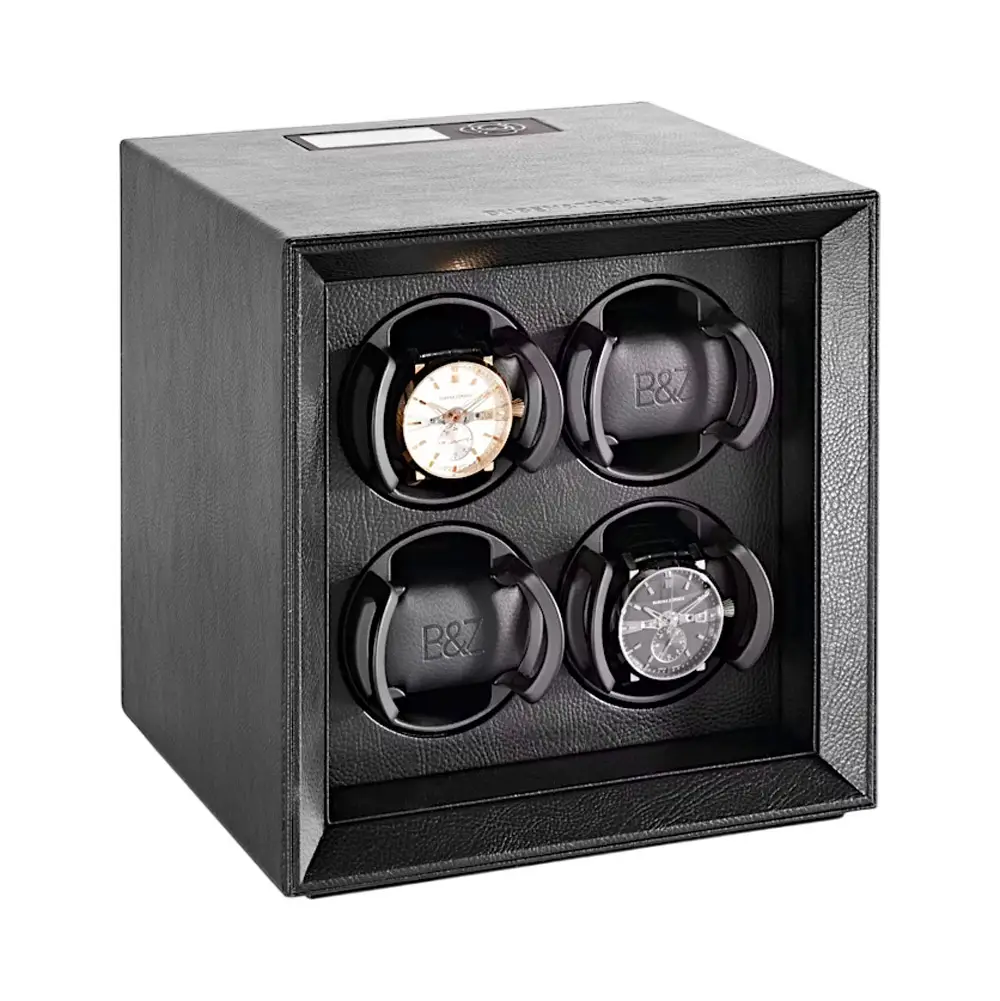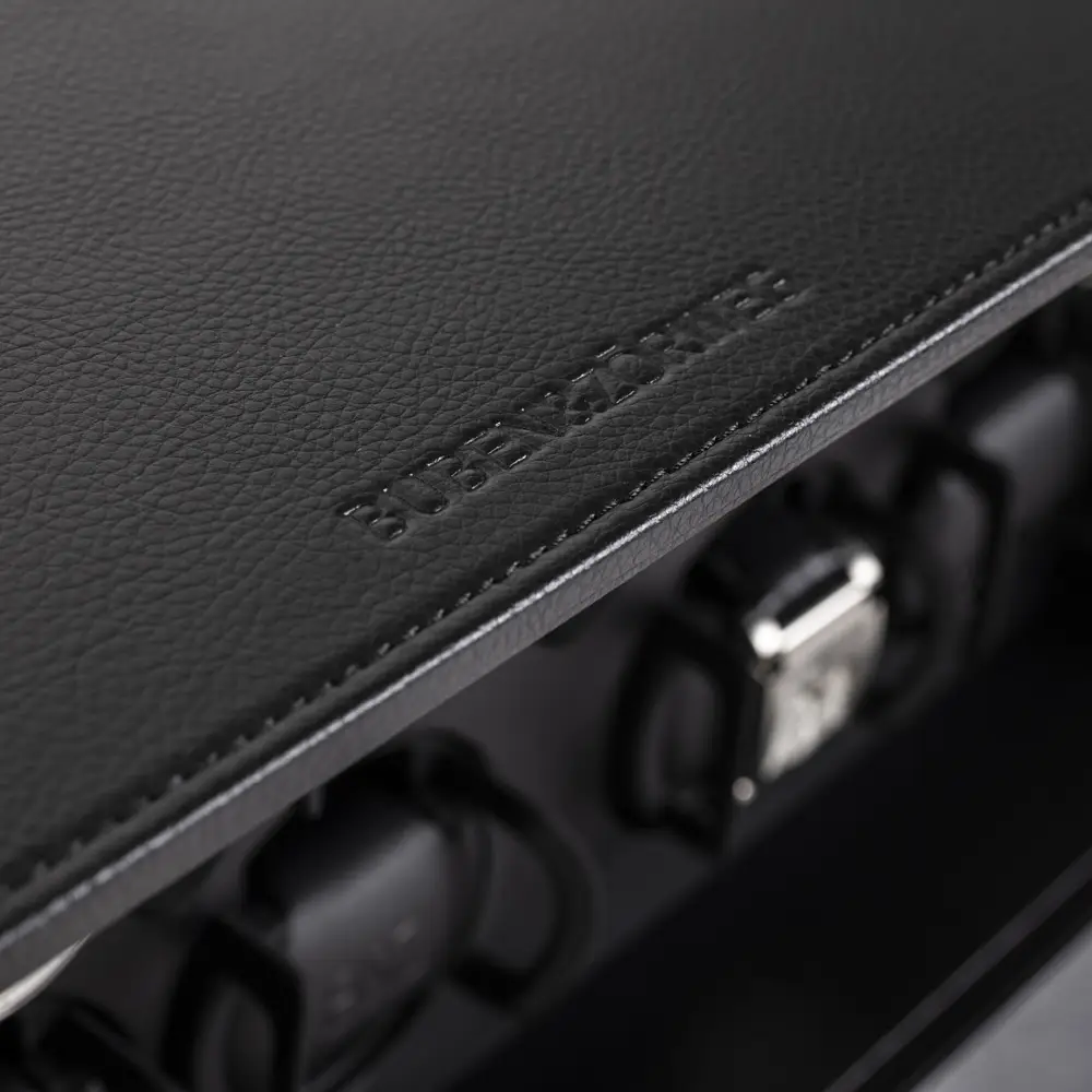 The Buben & Zorweg Safe Master 4 Black watch winder is the ideal choice for safely and elegantly storing up to four automatic watches. Its minimalist design, wrapped in luxurious black leather, combines understated aesthetics with precise German engineering. The compact cubic form allows for easy placement in interiors or safes, while the premium materials and refined craftsmanship highlight the distinctive character of Buben & Zorweg.
