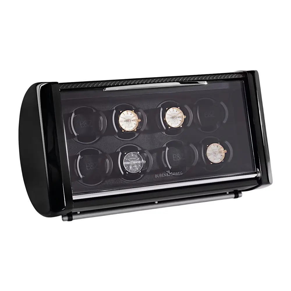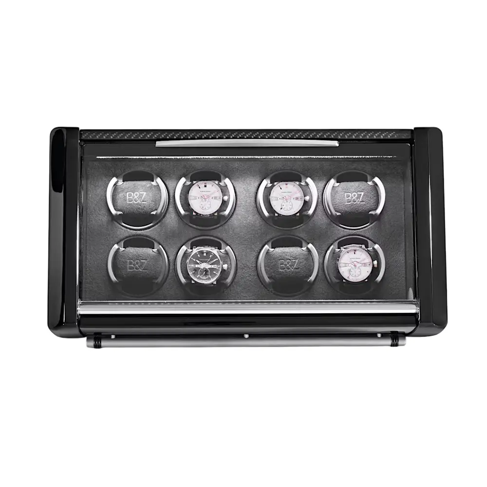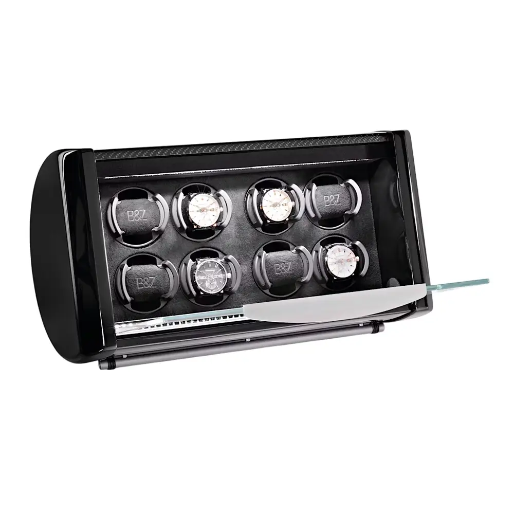 The Buben & Zorweg SPIRIT 8 watch winder represents the perfect fusion of luxurious design, technical precision, and master craftsmanship. Designed to accommodate up to eight automatic watches, it combines an elegant brushed aluminium body with refined details in carbon, croco leather, or macassar wood. The front safety glass panel allows you to admire your collection even while in motion, while the soft velour interior protects each timepiece from scratches.