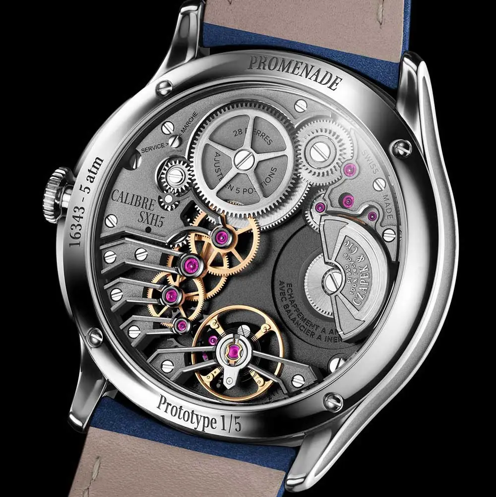 At the heart of the watch beats the in-house SXH5 automatic calibre, operating at a frequency of 28,800 vibrations per hour (4 Hz) and offering a 60-hour power reserve. The movement is visible through the transparent case back, revealing modern bridge architecture and delicate hand-decoration that honors the tradition of haute horlogerie.