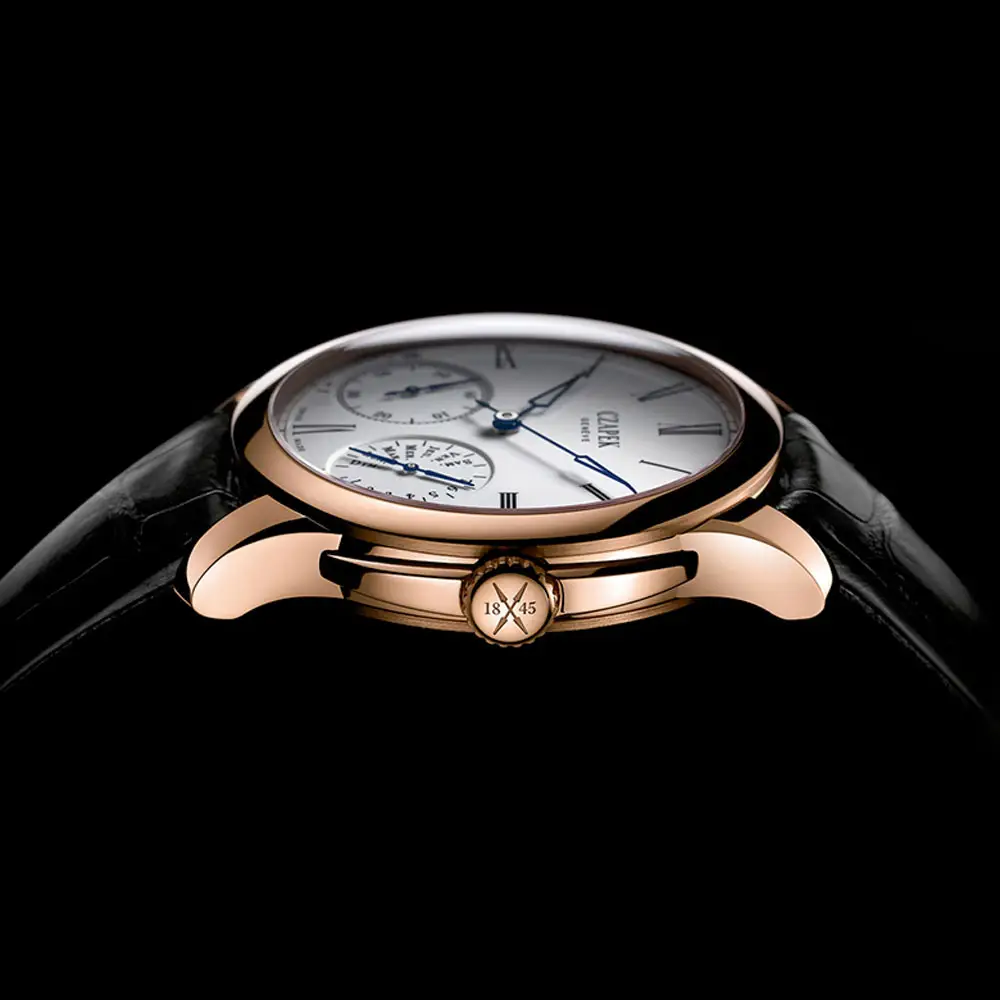 The luxurious 42.5 mm round case, crafted from 18-carat rose gold, embodies timeless elegance. The case is protected by durable sapphire crystal, beneath which lies a pristine white analog dial with meticulously designed details and a gracefully integrated day-of-the-week indicator. The harmonious proportions of the dial perfectly complement the warm hues of rose gold.