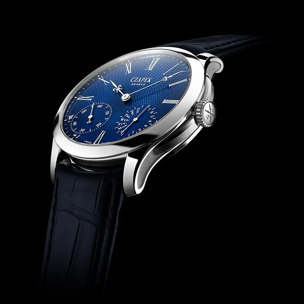 The Czapek Quai des Bergues Sapphire Blue L embodies exclusivity and refinement in perfect harmony with traditional watchmaking artistry. Independent Swiss brand Czapek & Cie celebrates precise craftsmanship, delicate details, and sophisticated elegance, inspired by the deep hue of sapphire blue.