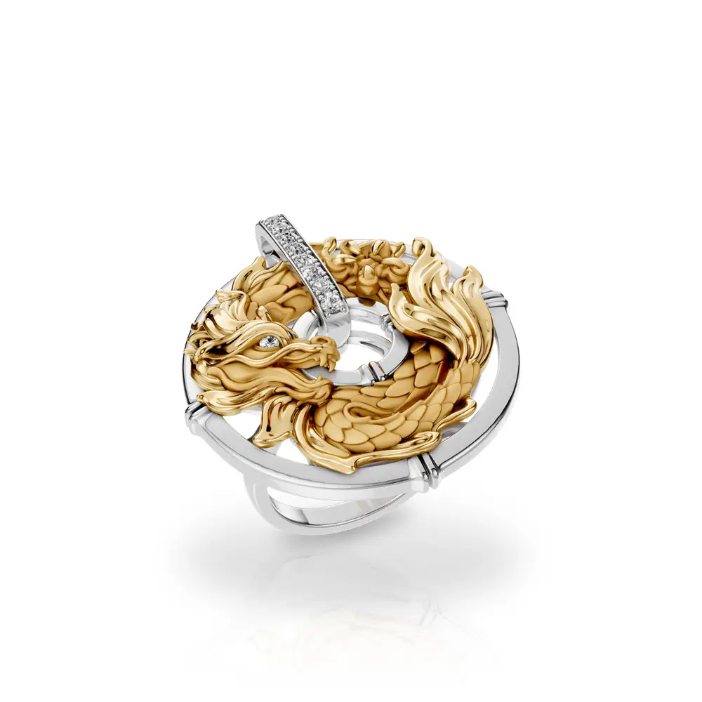 The Carrera y Carrera New Shanghai Medium Ring by Carrera y Carrera combines refined craftsmanship with elegant design. Made from 18k yellow and white gold, the ring offers a sophisticated contrast and timeless appeal. Inspired by oriental symbolism, the design reflects strength, harmony, and modern luxury.