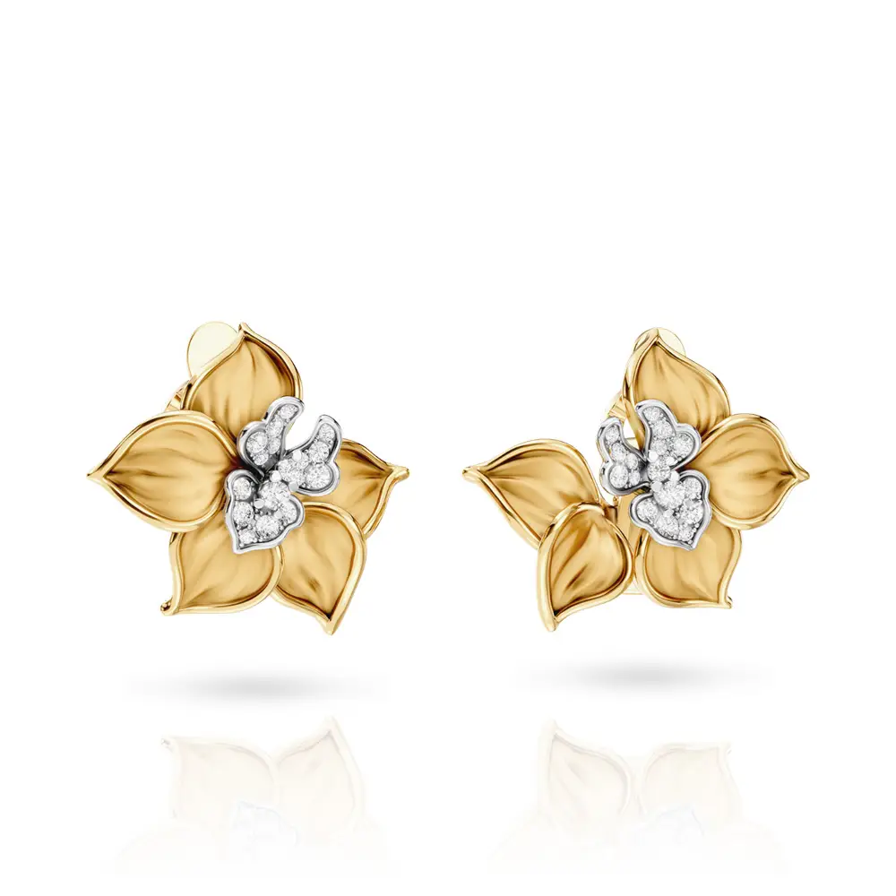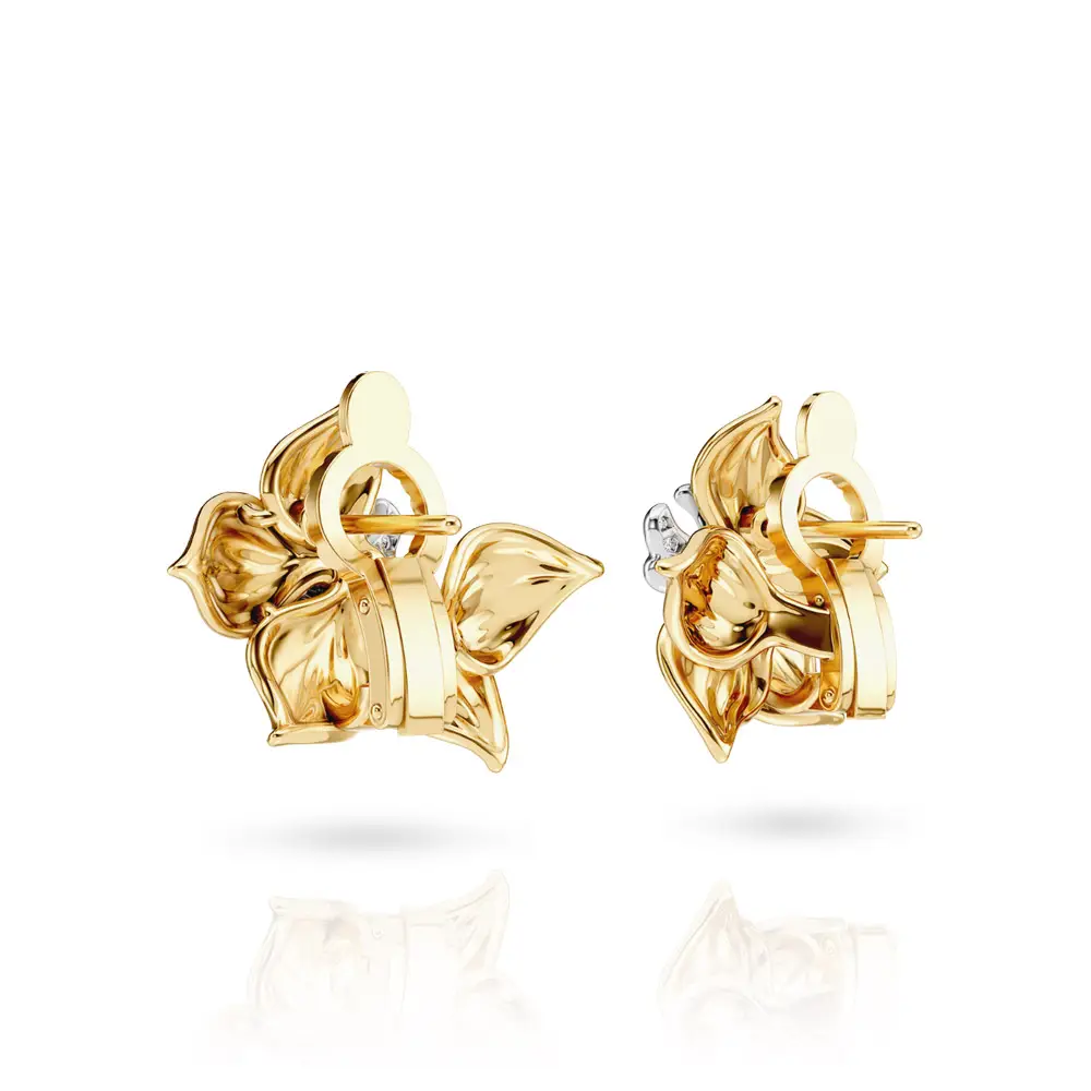 The Carrera y Carrera Orquídeas Maxi earrings from the Orquídeas collection by Carrera y Carrera represent a precisely crafted luxury piece inspired by the form of a blooming orchid. The earrings are made of 18k yellow and white gold, ensuring durability, longevity, and an elegant visual contrast. The dominant feature is a sculptural orchid motif, characterized by finely modeled petals and a sophisticated interplay of light.