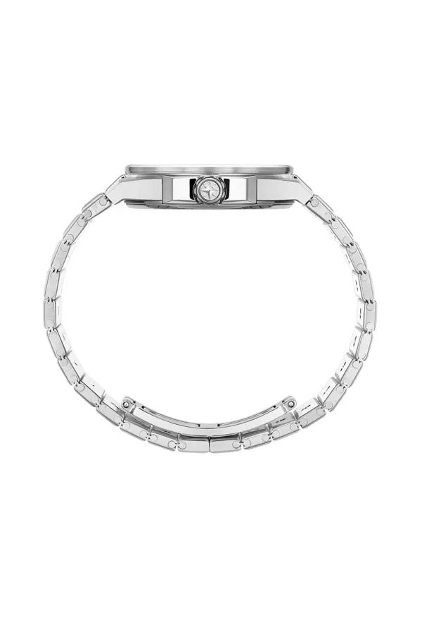 The watch features a round stainless steel case with a 33 mm diameter, perfectly complemented by an integrated silver-tone steel bracelet with a folding clasp, ensuring both comfort and security on the wrist. The blue dial, with its delicate texture reminiscent of an eagle’s iris, offers striking aesthetics and exceptional legibility thanks to bold hands and indexes.