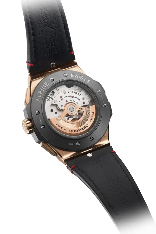 The 44 mm round case is framed by a rose gold bezel and features a striking black dial with subdials and a discreet date display. The automatic movement Chopard 03.05-C is a COSC-certified chronometer, operating at 28,800 vph (4Hz) with a 60-hour power reserve.
